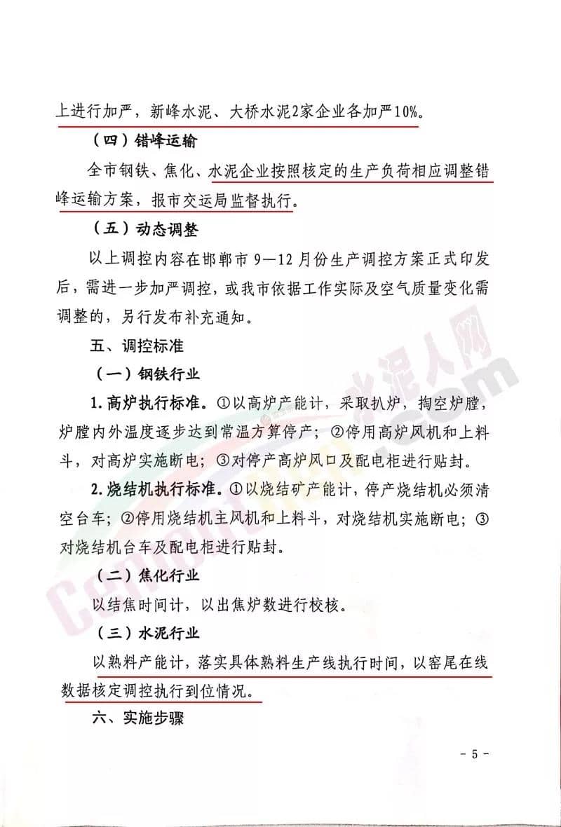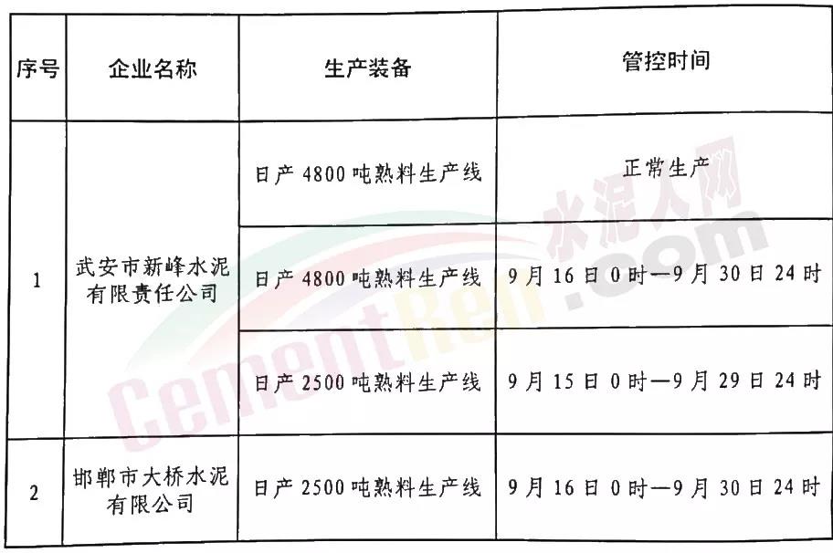 針對于水泥行業(yè)的調控原則為,在《邯鄲市2019年重點行業(yè)三季度大氣 污染防治差別化管理方案》核定的生產負荷基礎上進行加嚴,其中新峰水泥、大橋水泥2家企業(yè)各加嚴10%。