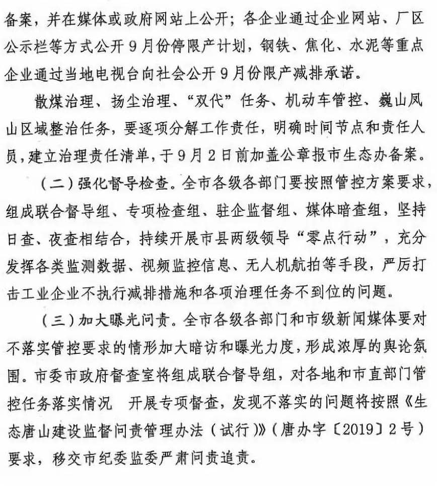 運輸物流方面要求全市鋼鐵、焦化、水泥等人后果按照核定的生產負荷相應調整錯峰運輸方案,并報市交運局監(jiān)督執(zhí)行。