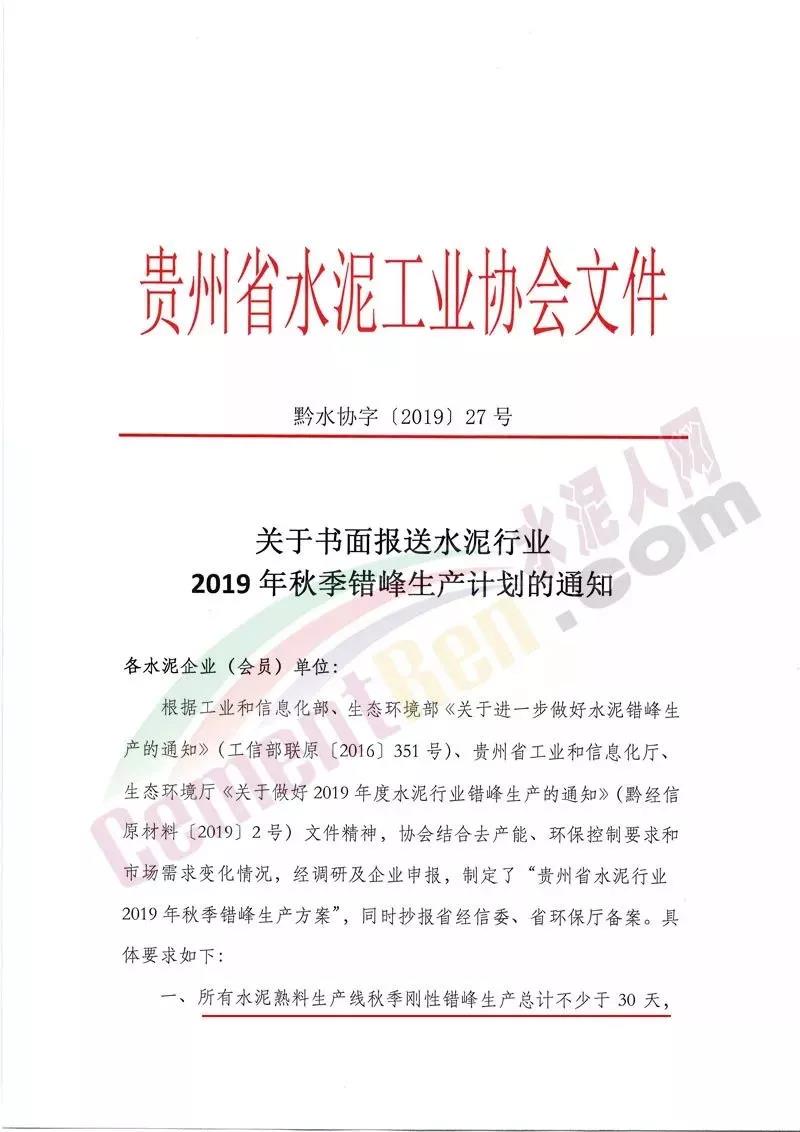 就在上個月初,由于貴州地區(qū)水泥價(jià)格一直低位運(yùn)行,水泥出廠價(jià)格低至200元/噸以下,當(dāng)?shù)孛耖g就傳出未來一個月貴州地區(qū)水泥價(jià)格將整體上漲100元/噸,價(jià)格調(diào)整到300元/噸,隨后不久貴州省水泥工業(yè)協(xié)會印發(fā)了“2019年秋季錯峰生產(chǎn)方案”,要求所有水泥熟料生產(chǎn)線秋季剛性錯峰生產(chǎn)總計(jì)不少于30天,原則上每月錯峰生產(chǎn)10天每窯。