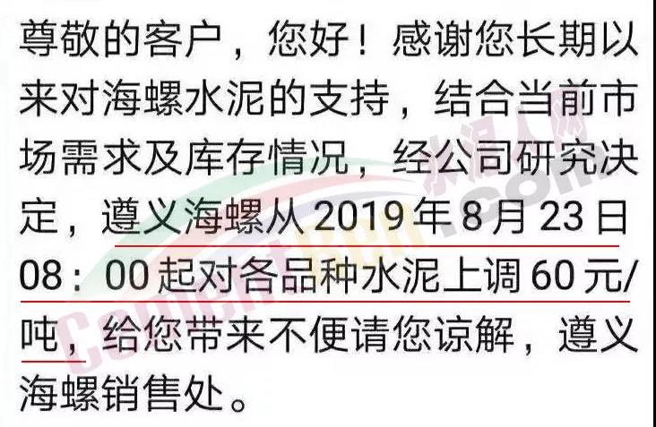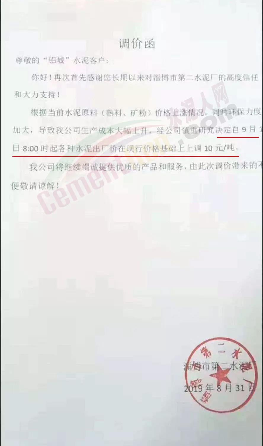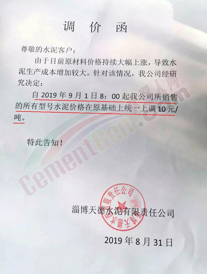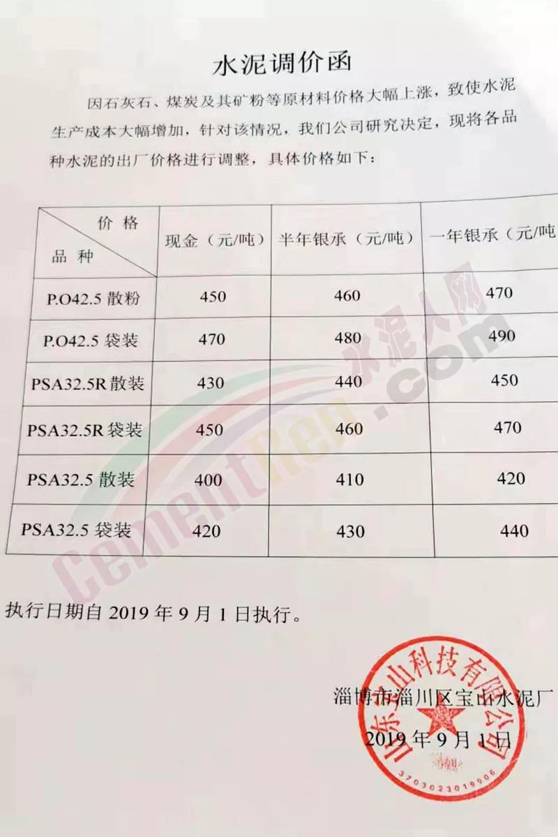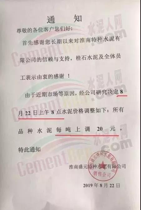 鄭州順寶水泥股份有限公司調(diào)價(jià)函稱:因原材料持續(xù)上漲和外部等因素影響,經(jīng)公司研究決定,自2019年9月1日7:30起,各品種水泥在原價(jià)格基礎(chǔ)上,統(tǒng)一上調(diào)20元/噸。