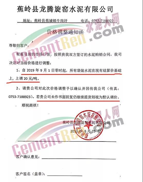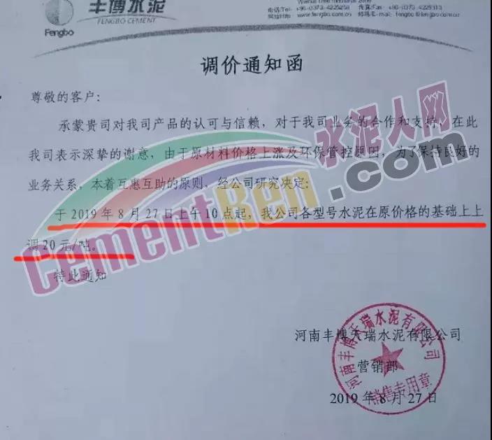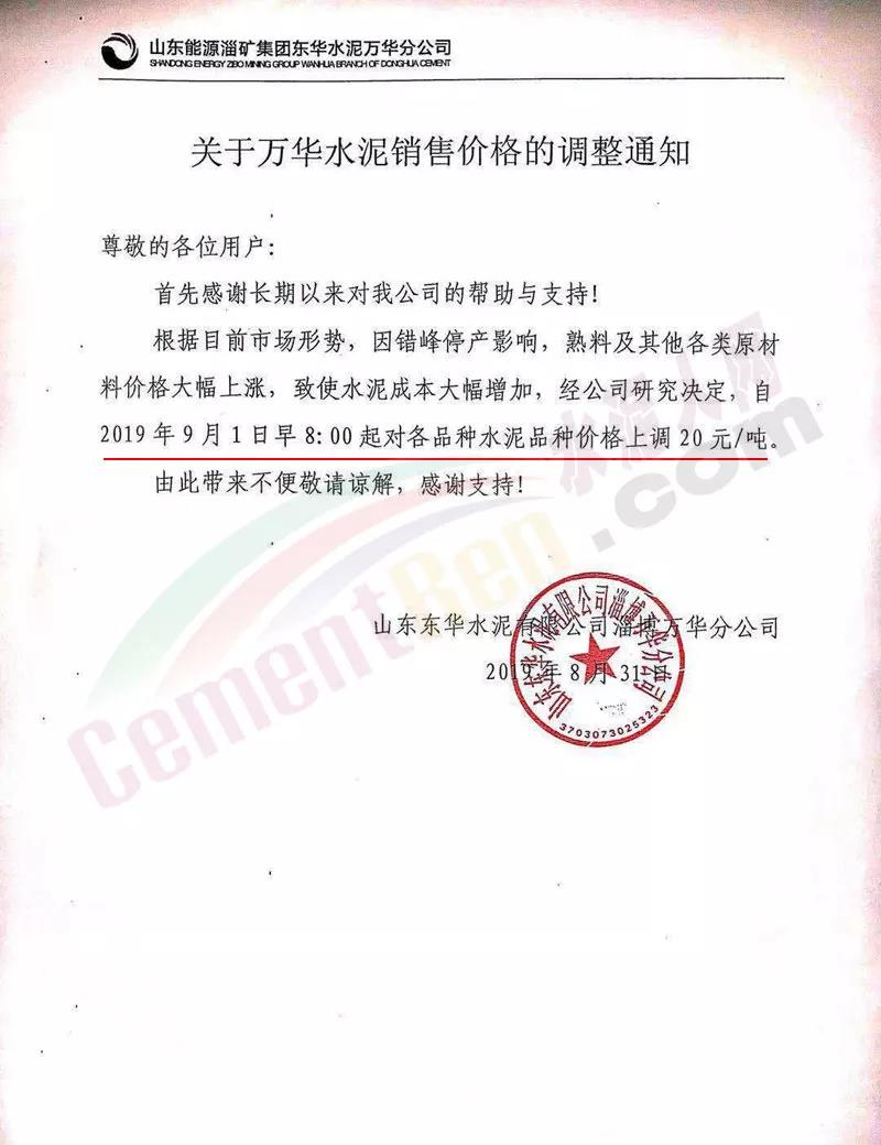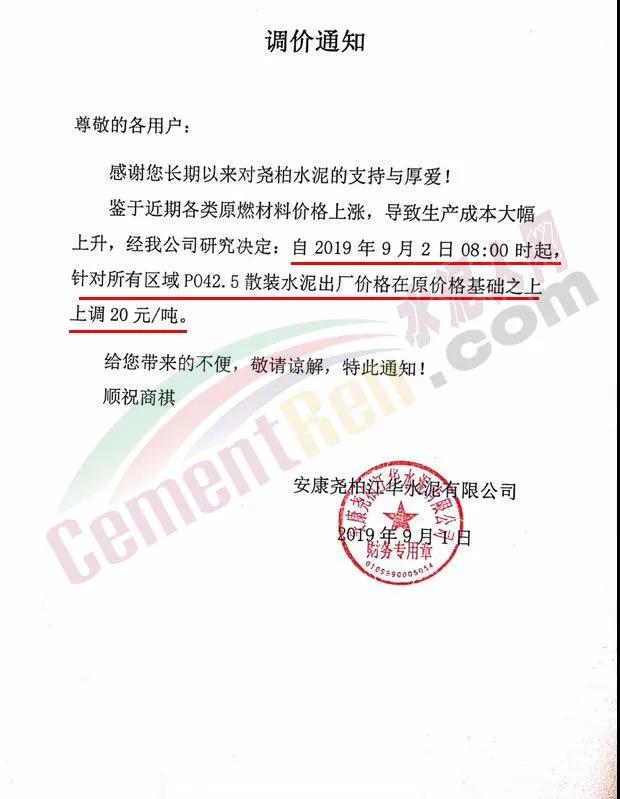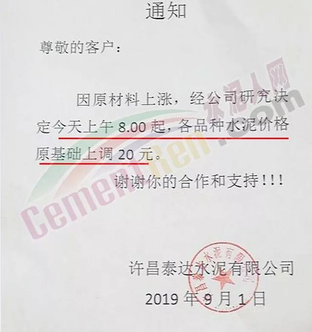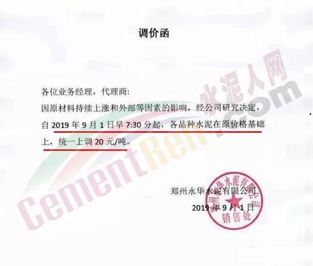 鄭州永華水泥有限公司發(fā)布調(diào)價(jià)函稱因原材料持續(xù)上漲和外部等因素影響,經(jīng)公司研究決定,自2019年9月1日7:30起,各品種水泥在原價(jià)格基礎(chǔ)上,統(tǒng)一上調(diào)20元/噸。
