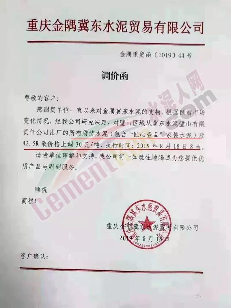 根據(jù)當(dāng)前市場形勢經(jīng)我公司研究決定,自2019年08月22日上午9:00點(diǎn)起所有水泥品種價(jià)格統(tǒng)一上調(diào)30元/噸。