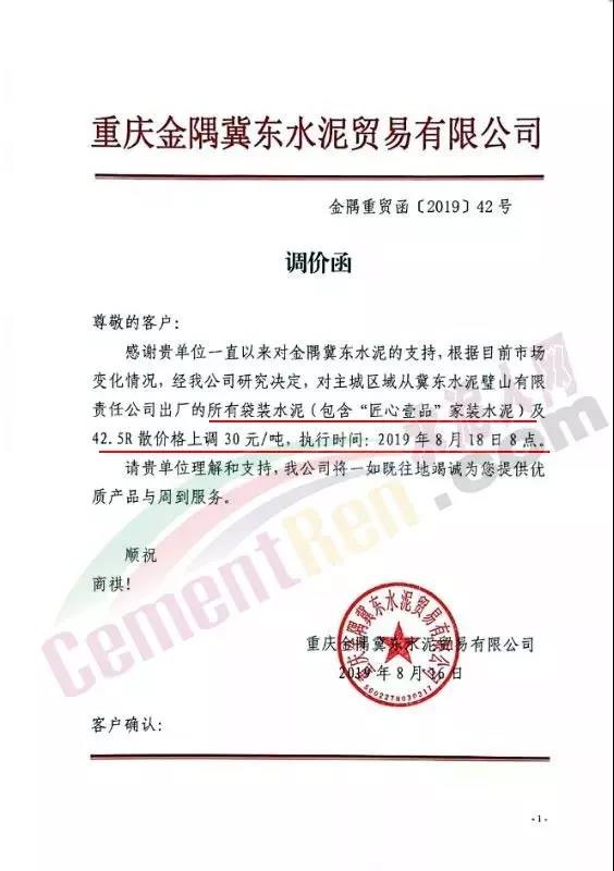 因近期原燃材料成本上漲,我公司現(xiàn)決定于2019年8月22日8:00針對PO42.5散裝價(jià)格進(jìn)行調(diào)整,價(jià)格上調(diào)60元/噸。
