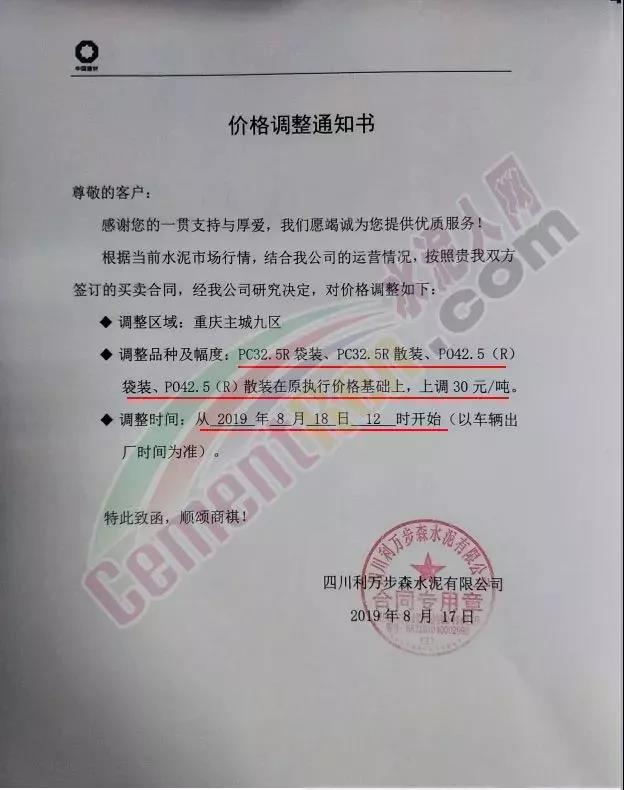 特別提醒您:根據(jù)當(dāng)前市場形勢及公司經(jīng)營情況,本公司決定:于2019年8月31日8時(shí)起對各品種袋裝及散裝水泥、熟料價(jià)格均上調(diào)30元/噸。