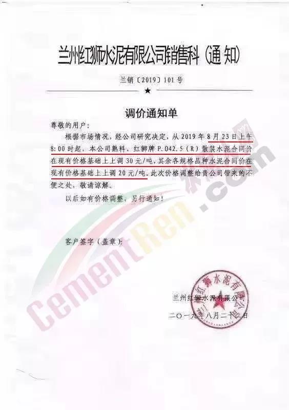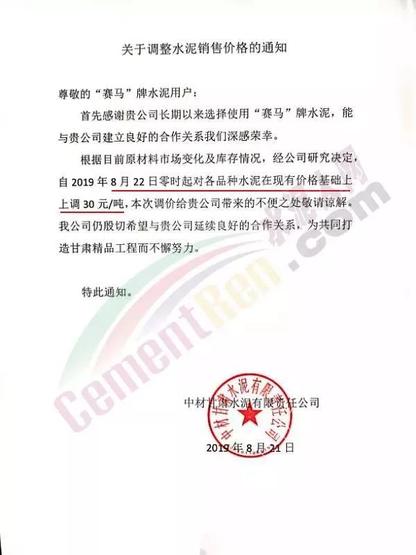中材甘肅水泥有限責(zé)任公司《關(guān)于調(diào)整水泥銷售價(jià)格的通知》稱自2019年8月22日零時(shí)起對各品種水泥在現(xiàn)有價(jià)格基礎(chǔ)上上調(diào)30元/噸。