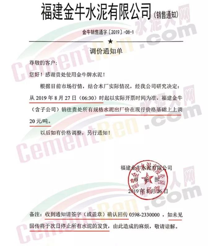 8月26日。福建省謀成水泥發(fā)展有限公司發(fā)布調(diào)價(jià)通知稱:根據(jù)目前市場行情,經(jīng)公司研究決定,自2019年8月27日零時(shí)起,我司各品種袋裝、散裝水泥出廠單價(jià)在原有基礎(chǔ)上上調(diào)20元/噸,本次調(diào)價(jià)為謀成水泥8月份的第二調(diào)價(jià),累計(jì)上調(diào)40元/噸。