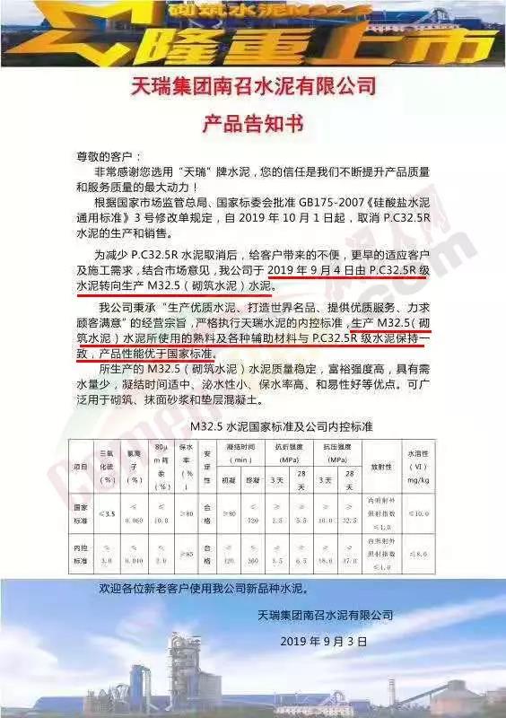 9月3日天瑞集團(tuán)南召水泥有限公司發(fā)布產(chǎn)品告知書稱,為減少P.C32.5R水泥取消后,給客戶帶來的不便,更高適應(yīng)客戶及施工需求,結(jié)合市場(chǎng)意見,公司將于9月4日由PC32.5R級(jí)水泥轉(zhuǎn)向生產(chǎn)M32.5砌筑水泥。公司將嚴(yán)格執(zhí)行天瑞水泥內(nèi)控標(biāo)準(zhǔn),生產(chǎn)M32.5水泥所用的熟料及各種輔助材料與P.C32.5R級(jí)水泥保持一致,且產(chǎn)品性能優(yōu)于國家標(biāo)準(zhǔn)。告知書原文如下: