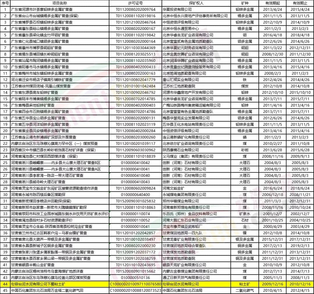 日前,自然資源部發(fā)布《關(guān)于43個(gè)勘查許可證和2個(gè)采礦許可證自行廢止的公告》稱:根據(jù)《礦產(chǎn)資源勘查區(qū)塊登記管理辦法》(1998年國務(wù)院令第240號(hào))第十條、《礦產(chǎn)資源開采登記管理辦法》(1998年國務(wù)院令第241號(hào))第七條、《國土資源部關(guān)于進(jìn)一步規(guī)范礦產(chǎn)資源勘查審批登記管理的通知》(國土資規(guī)〔2017〕14號(hào))第十三條和《國土資源部關(guān)于完善礦產(chǎn)資源開采審批登記管理有關(guān)事項(xiàng)的通知》(國土資規(guī)〔2017〕16號(hào))第二十二條的規(guī)定,經(jīng)核實(shí),“廣東省河源市葉茶寨鉛鋅多金屬礦普查”等43個(gè)探礦權(quán)、“句容臺(tái)泥水泥有限公司下蜀粘土礦”等2個(gè)采礦權(quán)在勘查許可證或采礦許可證有效期屆滿前未依法申請(qǐng)辦理延續(xù)登記手續(xù),勘查許可證和采礦許可證自有效期屆滿之日起已自行廢止,現(xiàn)予以公告。