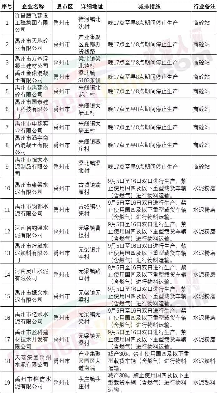 2、限產(chǎn)類企業(yè)中包括水泥粉磨站限產(chǎn)50%(以生產(chǎn)線計);商砼站晚17點至早8點期間停止生產(chǎn)。