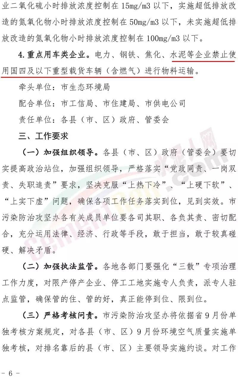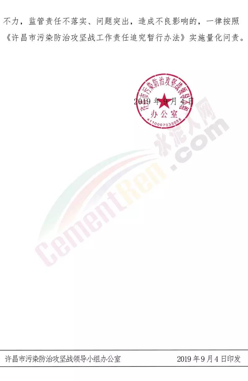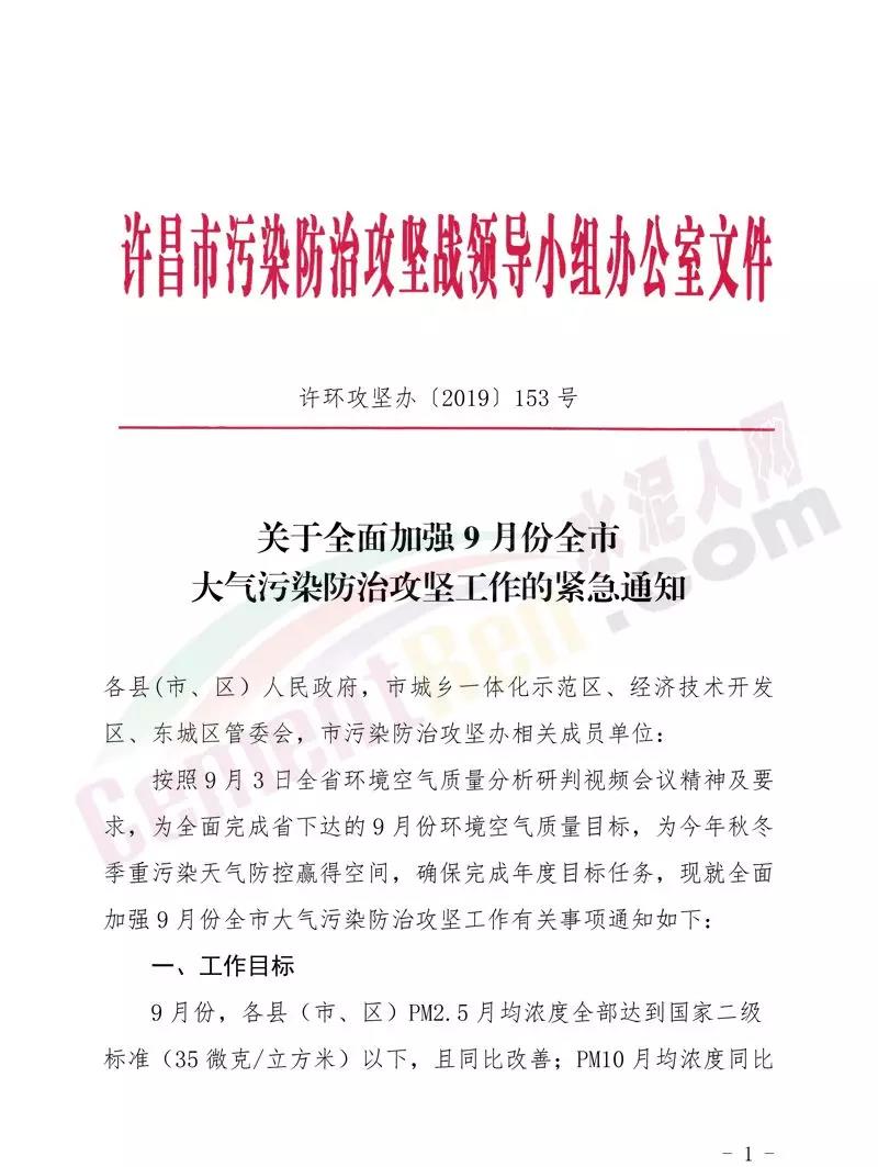 水泥人網(wǎng)消息:日前,許昌市污染防治攻堅戰(zhàn)領導小組辦公室發(fā)布《關于全面加強9月份全市大氣污染防治攻堅工作的緊急通知》稱按照9月3全省環(huán)境空氣質(zhì)量分析研判視頻會議精神及要求,為全面完成河南省下達的9月份環(huán)境空氣質(zhì)量目標,為今年秋冬季重污染天氣防控贏得空間,確保完成年度目標任務,就全面加強9月份全市大氣污染防治攻堅工作有關事項中包括強力實施工業(yè)減排,9月5日~16日期間,各縣(市、區(qū))工業(yè)企業(yè)顆粒物、二氧化硫、氮氧化物和揮發(fā)性有機物減排比例分別達到全社會排放總量20%以上。具體招待以下管控要求為: