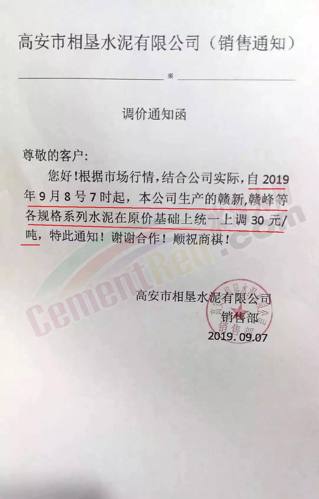 同期,分宜海螺水泥通知自9月7日8:00時(shí),上調(diào)各品種水泥價(jià)格30元/噸;高安市相墾水泥有限公司銷售部發(fā)調(diào)價(jià)通知函稱自9月8日7時(shí)起,公司所生產(chǎn)的贛新、贛峰等各規(guī)格系列水泥在原價(jià)基礎(chǔ)上統(tǒng)一上調(diào)30元/噸。