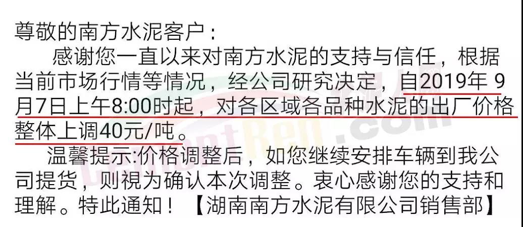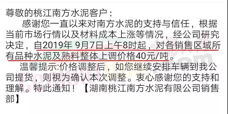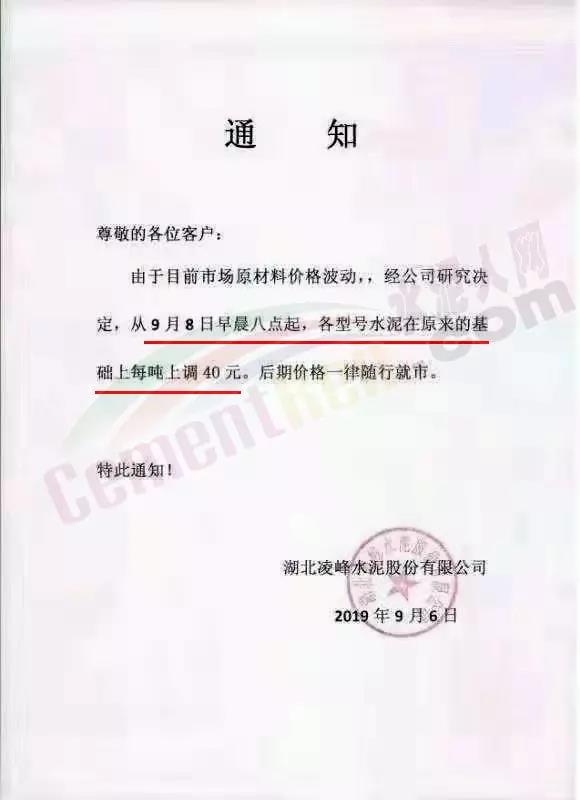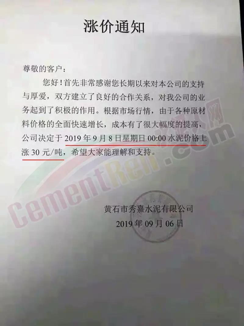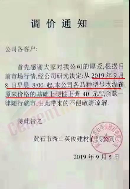 黃石市秀山英俊建材有限公司通知自今日(9月8日)早晨 8時(shí)起公司各種型號(hào)水泥在原價(jià)基礎(chǔ)上硬性上調(diào)40元/噸,余款一律隨行就市。