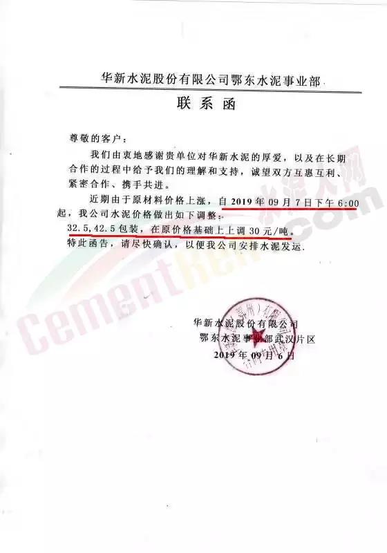 日前,華新水泥鄂東水泥事業(yè)部武漢片區(qū)發(fā)布聯(lián)系函稱,近期由于原材料價(jià)可靠上漲,自9月7下午6點(diǎn)起公司水泥價(jià)格32.5及42.5包裝在原價(jià)基礎(chǔ)上上調(diào)30元/噸。