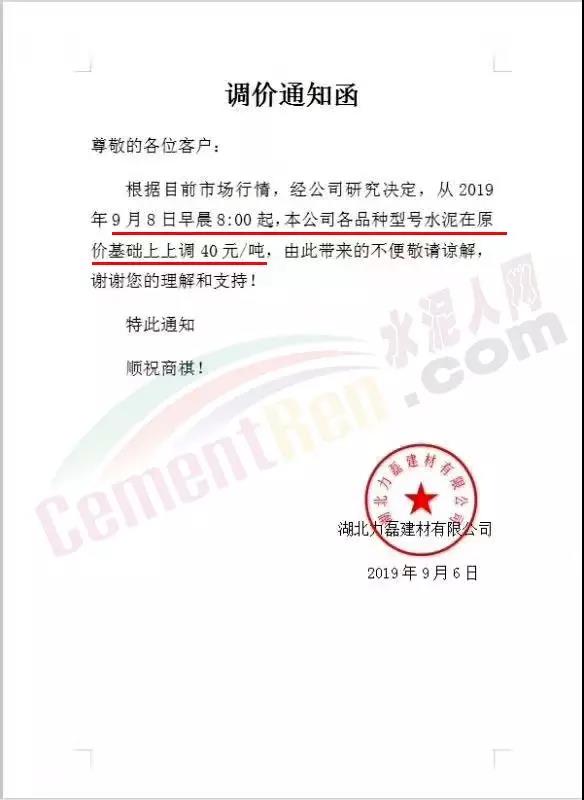 湖北力磊建材有限公司調(diào)價(jià)通知函稱,自根據(jù)目前市場(chǎng)行情,經(jīng)公司研究決定自今日(9月8日)早8點(diǎn)起公司各品種型號(hào)水泥在原價(jià)基礎(chǔ)上上調(diào)40元/噸。