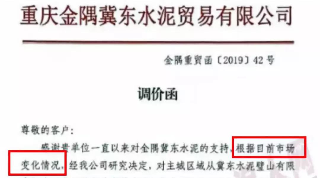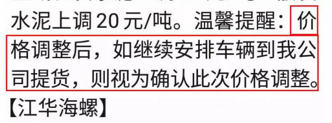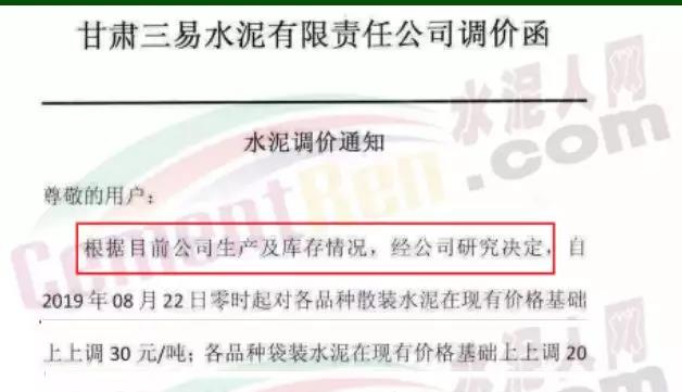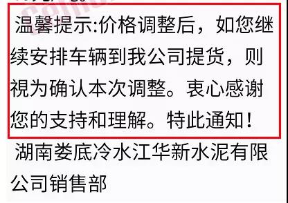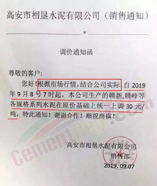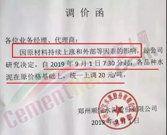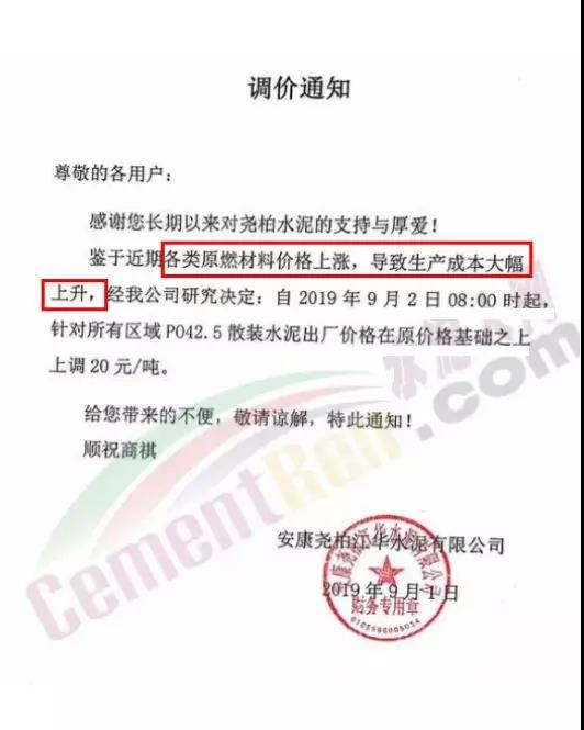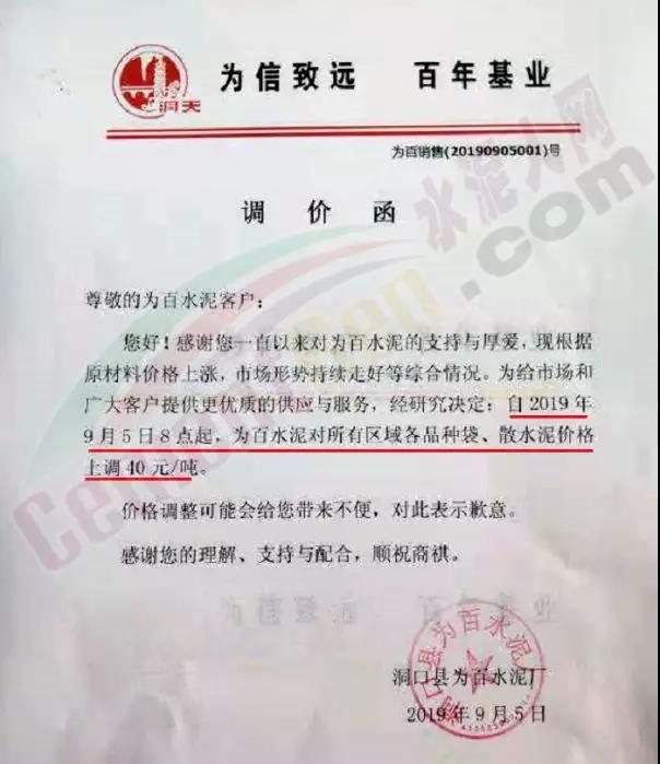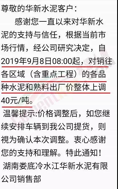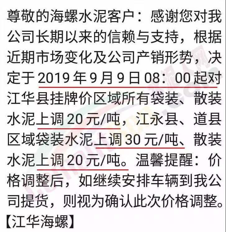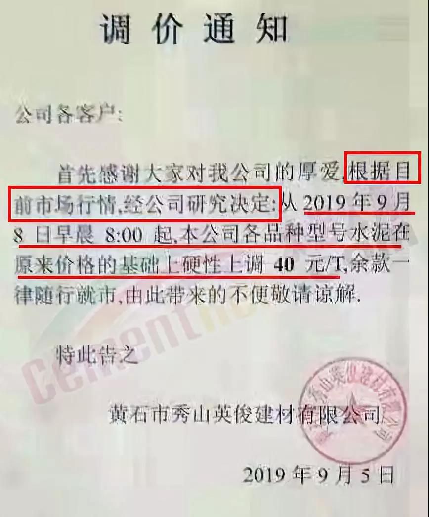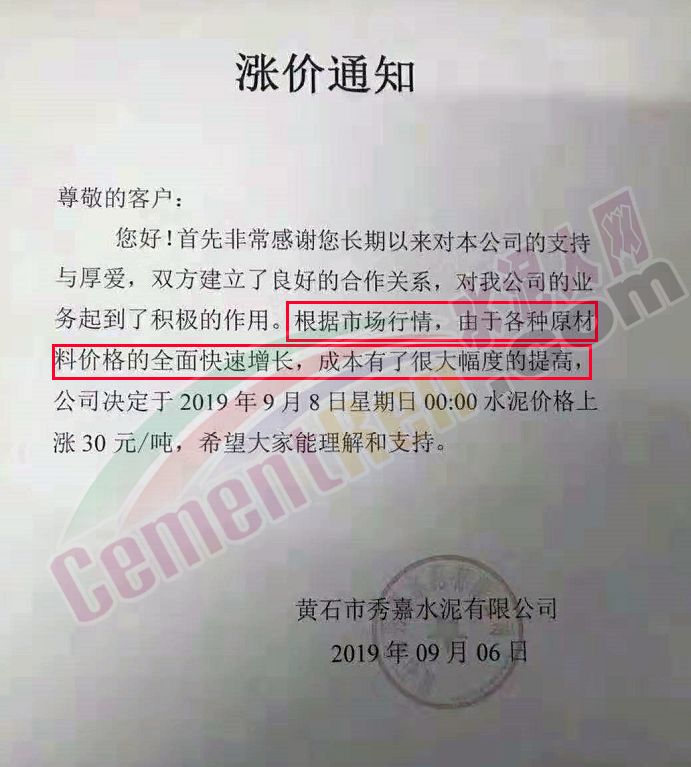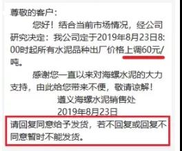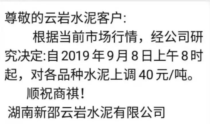 根據(jù)市場(chǎng)形勢(shì)及結(jié)合公司產(chǎn)、銷形勢(shì),于2019年9月8日晚上12鐘對(duì)各區(qū)域各品種水泥價(jià)格上調(diào)40元/噸,如貴方繼續(xù)安排運(yùn)輸車輛發(fā)貨則視為確認(rèn)同意本次價(jià)格調(diào)整,順祝商祺!