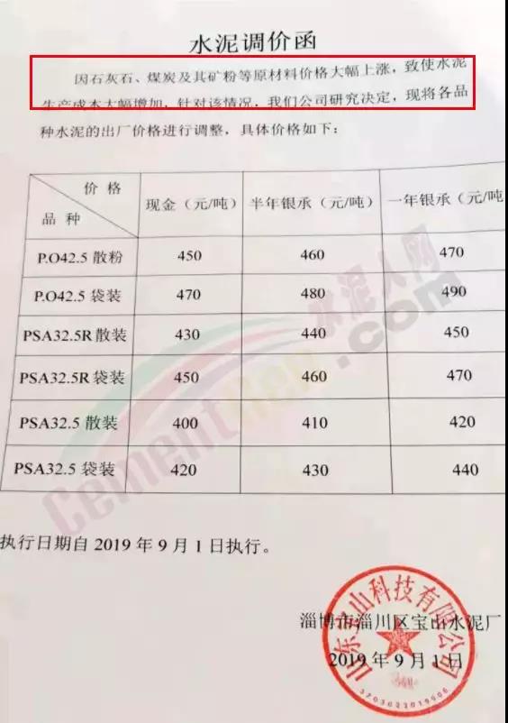 根據(jù)當(dāng)前市場(chǎng)形勢(shì),及原材料價(jià)格上漲等因素,經(jīng)研究決定,我公司于2019年9月9日7時(shí)起各規(guī)格水泥品種價(jià)格上調(diào)40元/噸。