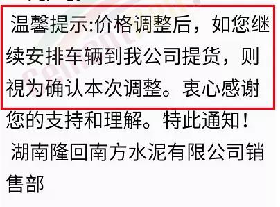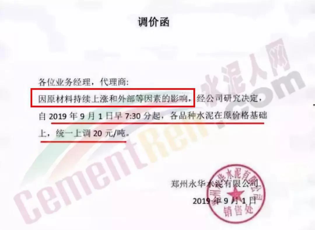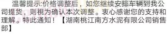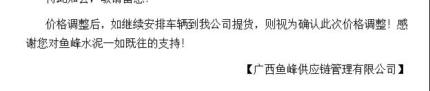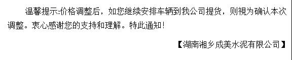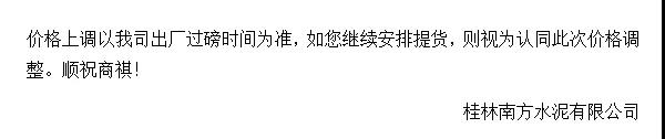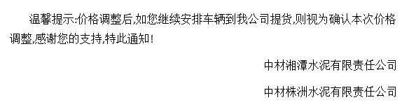 我公司決定于2019年9月10日零時(shí)起,對(duì)各品種水泥在原結(jié)算價(jià)格基礎(chǔ)上,上調(diào)20元/噸。順祝商祺!友情提醒:價(jià)格調(diào)整后,如繼續(xù)安排車輛到我司提貨,視為確認(rèn)此次價(jià)格調(diào)整。