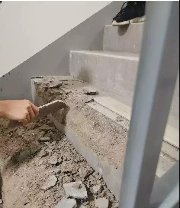 可直到最近,小區(qū)業(yè)主群里有人稱,有業(yè)主在走安全通道樓梯時,一腳將水泥臺階踩碎,險些摔倒,讓大家一下警覺了起來。“要知道,樓梯臺階可是水泥的呀,正常人上下臺階,怎么可能把水泥樓梯給踩碎了。這未免也太嚇人了吧。”一位業(yè)主說,“因為安全通道平時大家也沒特別注意,一聽到這消息,業(yè)主群里就炸開了鍋。隨后大伙就去試了試,真的是拿根棍子隨便敲幾下,那水泥臺階就嘩啦啦的掉渣子。這工程明顯就是豆腐渣。”
