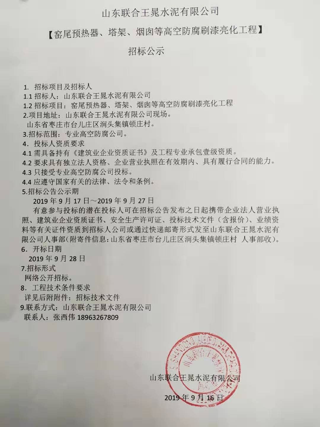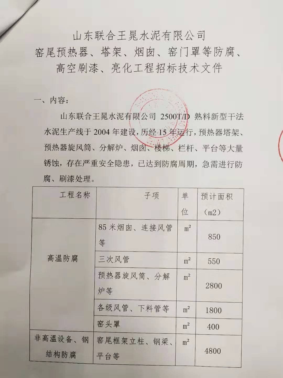 據(jù)水泥人網(wǎng)消息,近日山東聯(lián)合王晁水泥有限公司委托水泥人網(wǎng)針對(duì)窯尾預(yù)熱器、塔架、煙囪、窯門(mén)罩等防腐、高空刷漆、亮化工程招標(biāo)。