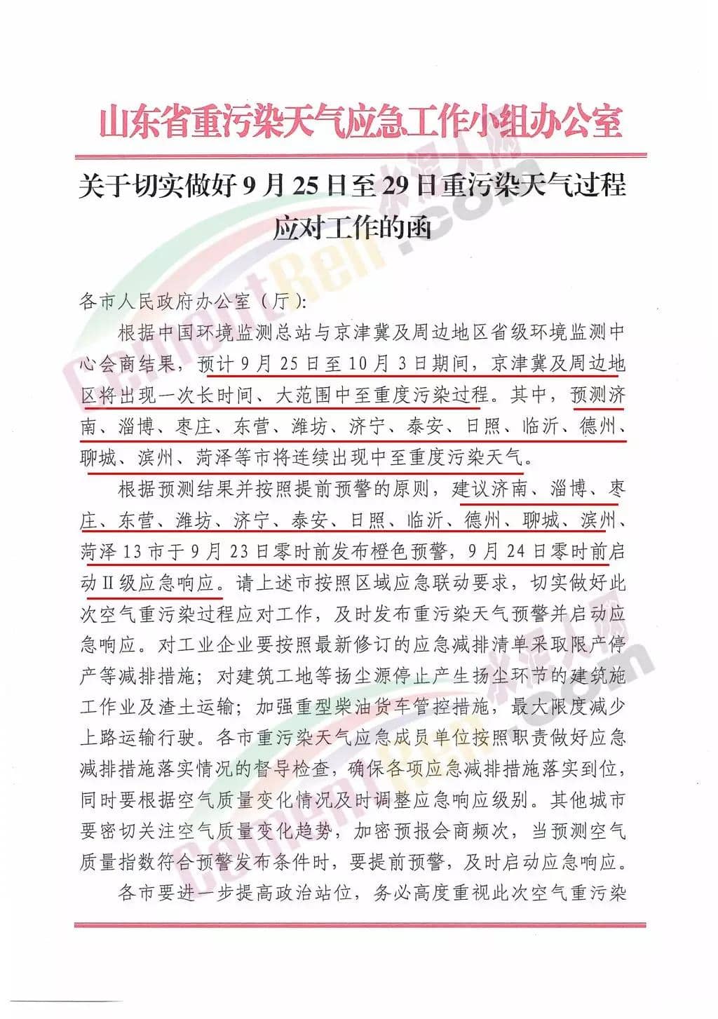 山東省13個市今日零點(diǎn)前啟動大氣應(yīng)急方案!水泥企業(yè)停限產(chǎn)!山東省重污染天氣應(yīng)急工作小組辦公室《關(guān)于切實(shí)做好9月25日至29日重污染天氣過程應(yīng)對工作的函》稱:預(yù)計9月25日至10月3日期間,京津冀及周邊地區(qū)將出現(xiàn)一次長時間、大范圍中至重度污染過程。其中預(yù)測濟(jì)南、淄博、棗莊、濟(jì)寧、泰安、日照、荷澤等13市將連續(xù)出現(xiàn)中至重度污染天氣,根據(jù)預(yù)測結(jié)果并按照提前預(yù)警的原則,建議濟(jì)南、淄博、棗莊、東營、濰坊、濟(jì)寧、泰安、日照、臨沂、德州、聊城、濱州、荷澤13市于今日(9月23日)零時前啟動II級應(yīng)急響應(yīng)。并請上述13市按照區(qū)域應(yīng)急聯(lián)動要求,切實(shí)做好此次空氣重污染過程應(yīng)對工作。對工業(yè)企業(yè)要按照最新修訂的應(yīng)急減排清單采取限產(chǎn)停產(chǎn)等減排措施。對建筑工地?fù)P塵源停止產(chǎn)生揚(yáng)塵環(huán)節(jié)的建筑施工作業(yè)及渣土運(yùn)輸;加強(qiáng)重型柴油車管控措施,最大限度減少上路運(yùn)輸行駛。