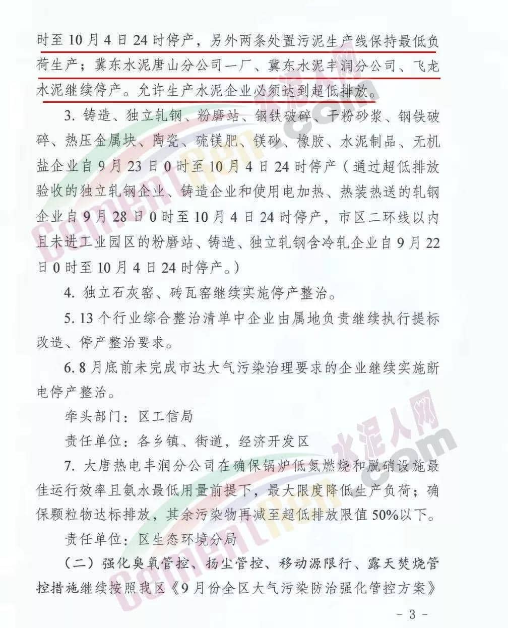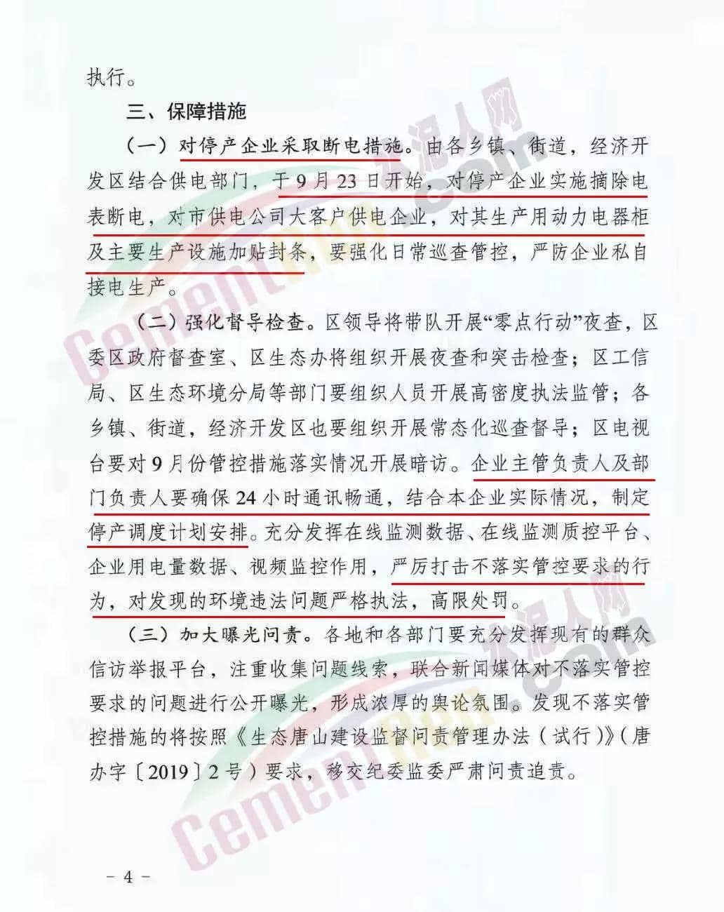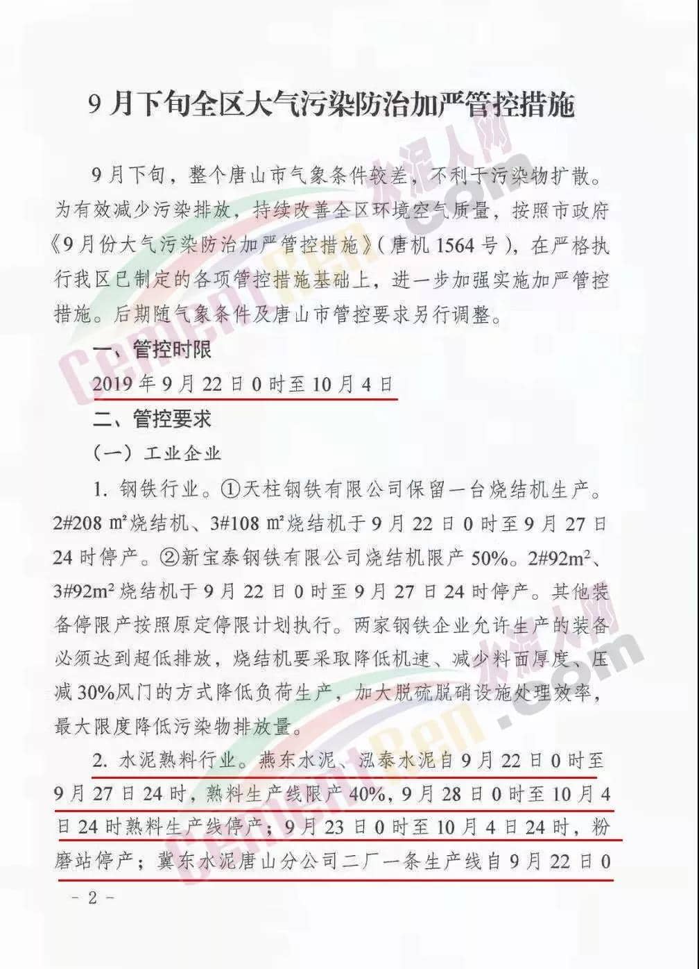 管控時限:2019年9月22日0時至10月4日水泥熟料行業(yè):一、燕東水泥、泓泰水泥自9月22日0時至9月27日24時,熟料生產(chǎn)線限產(chǎn)40%,9月28日0時至10月4日24時熟料生產(chǎn)線停產(chǎn);9月23日0時于10月4日24時,粉磨站停產(chǎn);二、冀東水泥唐山分公司二廠一條生產(chǎn)線自9月22日0時至10月4日24時停產(chǎn),另外兩條處置污泥生產(chǎn)線保持最低負(fù)荷生產(chǎn);三、冀東水泥唐山分公司一廠、冀東水泥豐潤分公司、飛龍水泥繼續(xù)停產(chǎn)。允許生產(chǎn)的水泥企業(yè)必須達(dá)到超低排放。對于停產(chǎn)企業(yè)采取斷電措施,由各鄉(xiāng)鎮(zhèn)、街道、經(jīng)濟(jì)開發(fā)區(qū)結(jié)合供電部門,于9月23日開始,對停產(chǎn)企業(yè)實(shí)施摘除電表斷電,對市供電公司大客戶供電企業(yè),對其生產(chǎn)用動力電器柜及主要生產(chǎn)設(shè)施加貼封條,要強(qiáng)化日常巡查管控,嚴(yán)防企業(yè)私自接電生產(chǎn)。強(qiáng)化督導(dǎo)檢查期間,區(qū)領(lǐng)導(dǎo)將帶隊開展“零點(diǎn)行動”夜查,區(qū)委區(qū)政府督查室、區(qū)生態(tài)辦將組織開展夜查和突擊檢查等,區(qū)電視臺要對9月份管控措施落實(shí)情況開展暗訪。企業(yè)主管負(fù)責(zé)人及部分負(fù)責(zé)人要確保24小時通訊申通,結(jié)合本企業(yè)實(shí)際情況,制定停產(chǎn)調(diào)度計劃安排。嚴(yán)厲打擊不落實(shí)管控要求的行為,對發(fā)現(xiàn)的環(huán)境違法問題嚴(yán)格執(zhí)法,高限處罰?!?月下旬大氣污染防治加嚴(yán)管控措施》全文如下: