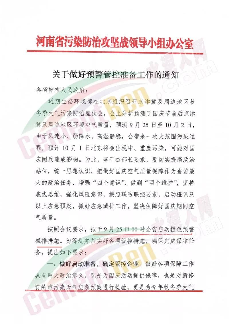 同期,河南省污染防治攻堅(jiān)戰(zhàn)領(lǐng)導(dǎo)小組辦公室發(fā)布《關(guān)于做好預(yù)警管控準(zhǔn)備工作的通知》稱(chēng),擬于9月25日0時(shí)全省啟動(dòng)橙色預(yù)警減排措施。通知全文如下: