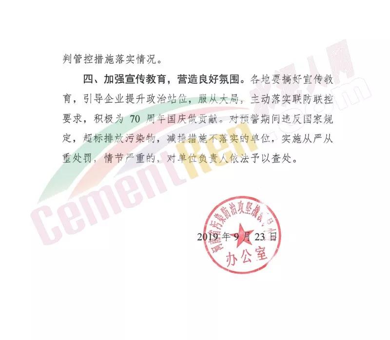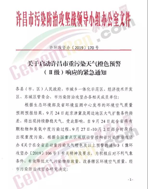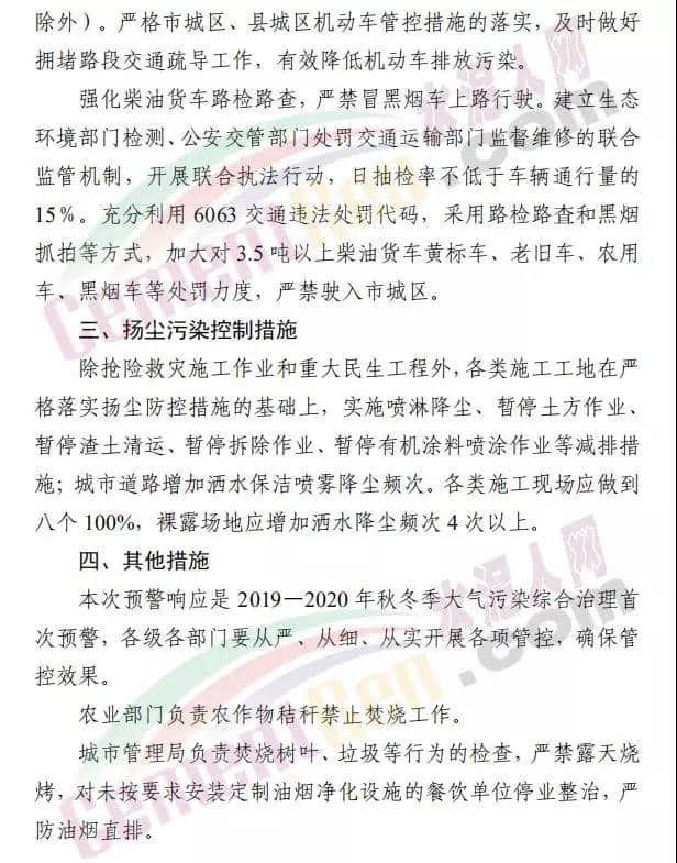 日前,繼河南省新鄉(xiāng)市,安陽(yáng)市發(fā)布重污染天氣紅色預(yù)警后,開(kāi)封市也發(fā)布了紅色預(yù)警通知。通知要求所轄區(qū)區(qū)域于2019年9月24日0時(shí)啟動(dòng)紅色預(yù)警(Ⅰ)級(jí)響應(yīng),預(yù)警解除時(shí)間另行通知 。通知要求水泥粉磨站、露天石材加工等行業(yè)實(shí)施停產(chǎn)措施。