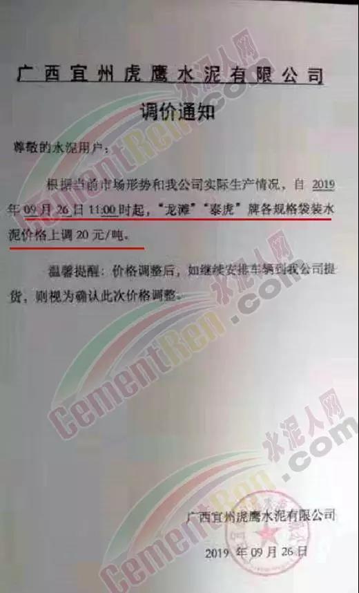 根據(jù)當前市場形勢及我司生產(chǎn)情況,我公司決定于2019年9月26日8時,上調(diào)所有品種袋裝、散裝水泥價格30元/噸。價格上調(diào)以我司出廠過磅時間為準,如您繼續(xù)安排提貨,則視為認同此次價格調(diào)整。順祝商祺!