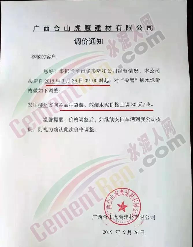 由于原材料價格上漲,公司經(jīng)營成本上升,結合當前市場行情變化,經(jīng)公司研究決定于2019年9月26日8:00開始對隆回區(qū)域各品種水泥價格上調(diào)30元/噸。