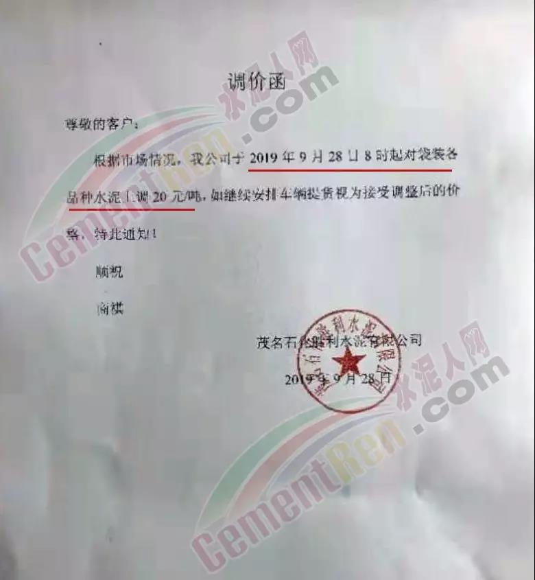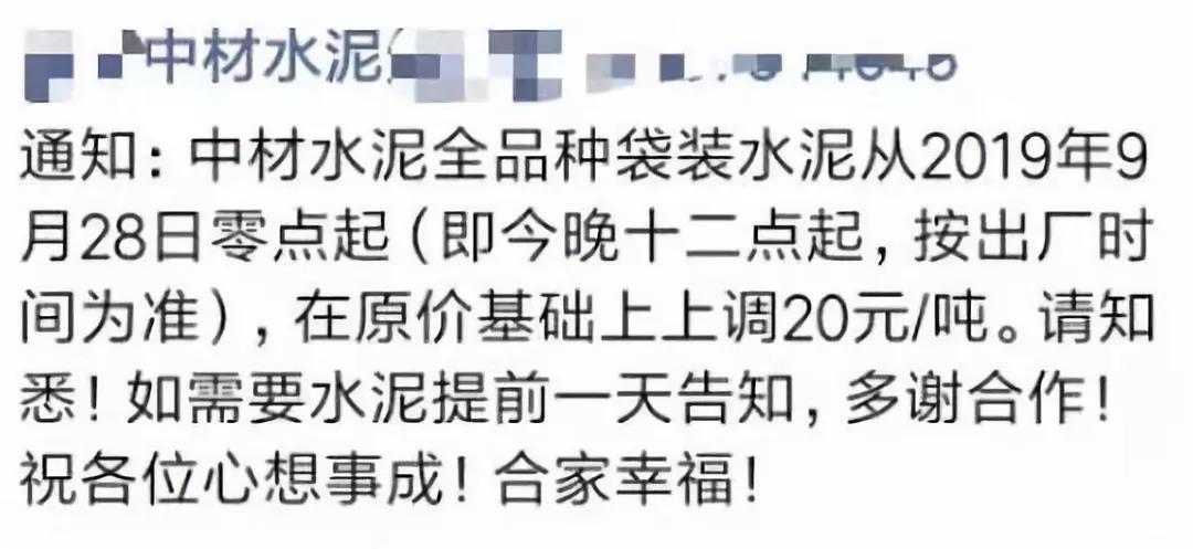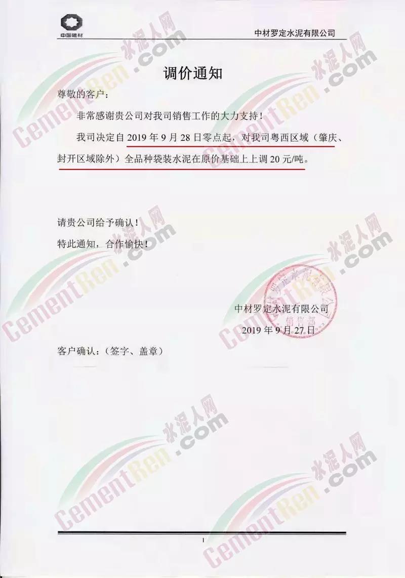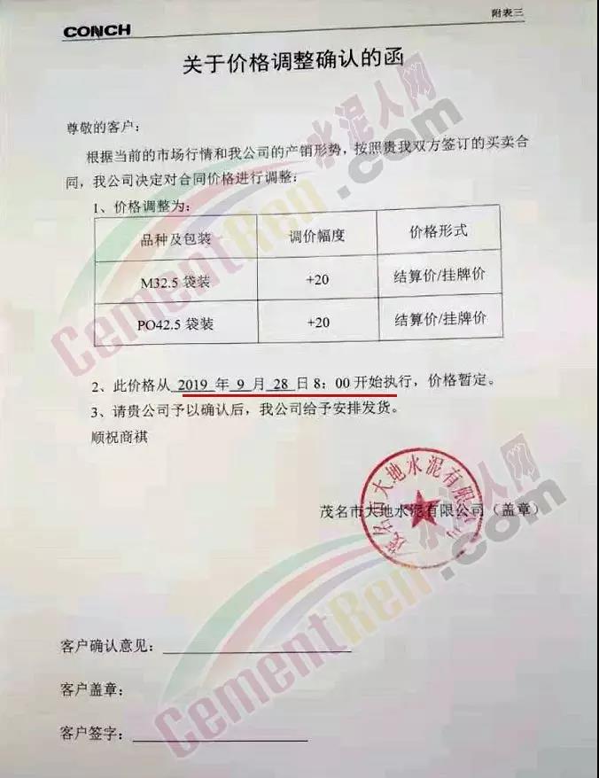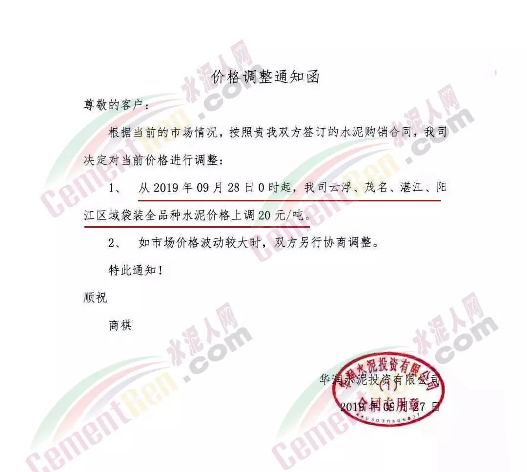 根據(jù)市場(chǎng)行情,弋陽(yáng)海螺決定于2019年9月28日08:00時(shí)起,針對(duì)M32.5袋裝、PO42.5袋裝水泥價(jià)格上調(diào)20元/噸,PC42.5袋裝水泥價(jià)格上調(diào)30元/噸,如您繼續(xù)安排車輛到我公司提貨,則視為您同意和確認(rèn)本次價(jià)格調(diào)整。
