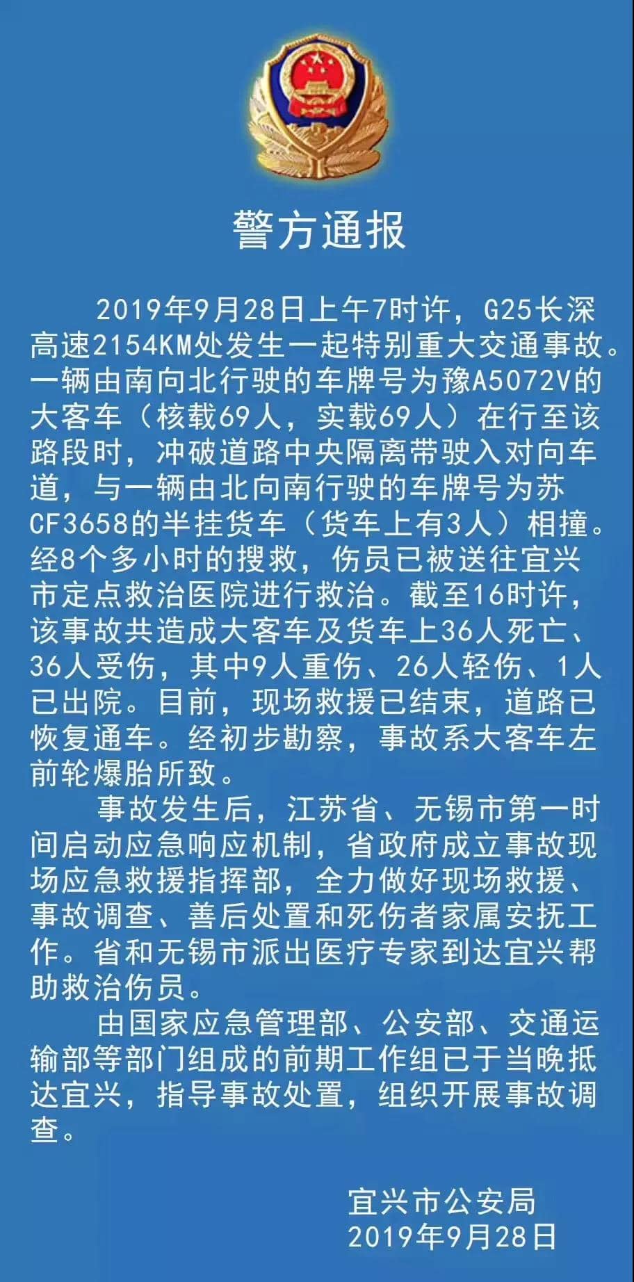 事故報(bào)道▼據(jù)了解,此次事故是—輛車牌號(hào)為豫A5072V的大客車(核載69人,實(shí)載69人)沖破中央隔離帶,闖入對(duì)向車道,與一輛車牌號(hào)為蘇CF3658的半掛貨車(貨車上有3人)相撞。截至28日16時(shí)許,該事故共造成大客車及貨車上36人死亡、36人受傷,其中9人重傷、26人輕傷、1人已出院。警情通報(bào)▼