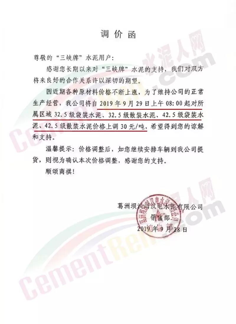 根據(jù)當前市場形勢及產(chǎn)銷存情況,我公司定于2019年9月30日8:00對袋裝和散裝所有品種水泥價格上調(diào)20元/噸。順祝商祺!溫馨提示:價格調(diào)整后,如繼續(xù)安排車輛到我司提貨,視為確認此次價格調(diào)整!感謝您的信任與支持!