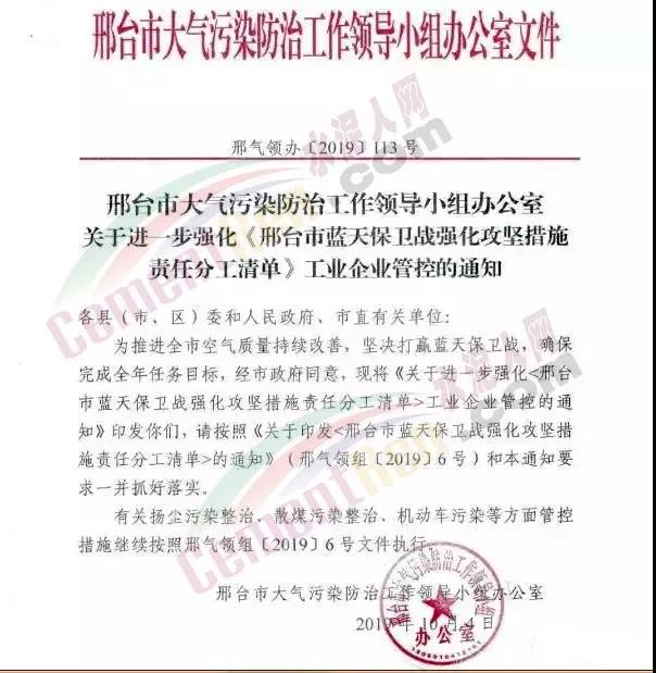 水泥人網(wǎng)消息:10月4日,邢臺(tái)大氣辦發(fā)布關(guān)于進(jìn)一步強(qiáng)化《邢臺(tái)市藍(lán)天保衛(wèi)戰(zhàn)強(qiáng)化攻堅(jiān)措施責(zé)任分工清單》工業(yè)企業(yè)管控的通知