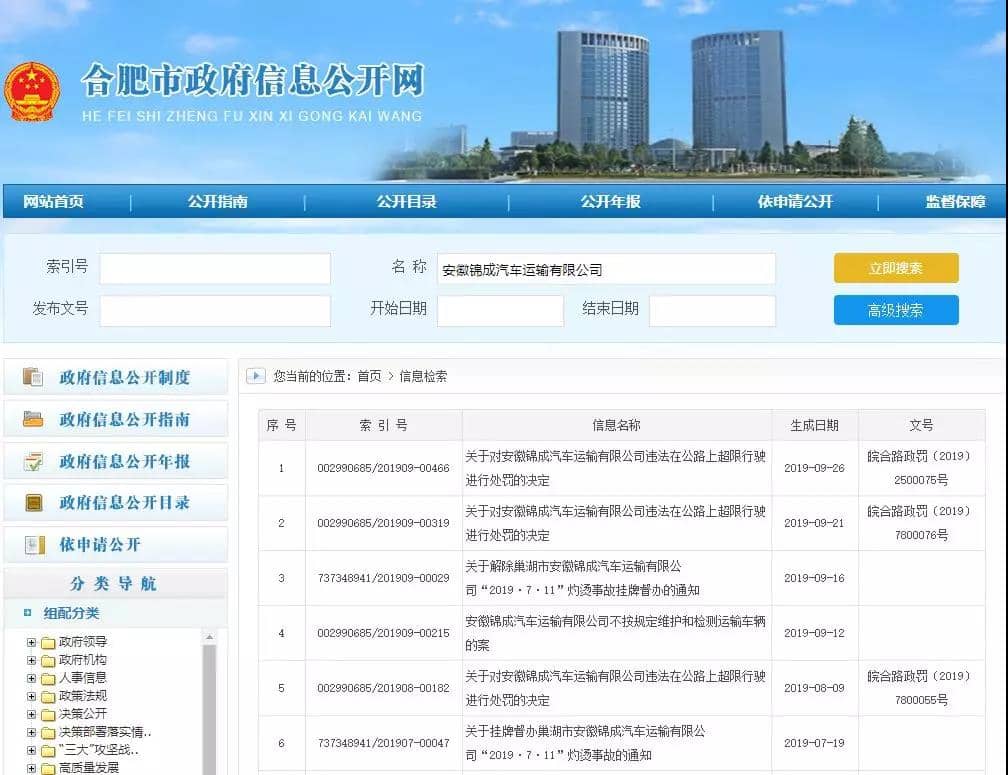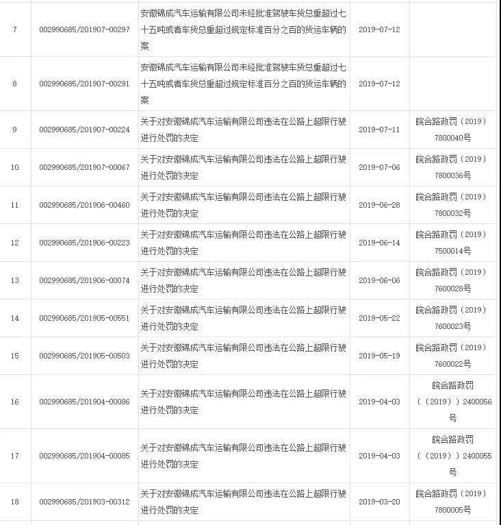 據(jù)安徽省合肥市政府信息公開網(wǎng)信息顯示,近兩個月來涉事企業(yè)安徽錦成汽車運輸有限公司被處罰多次。自8月9日以來,上述企業(yè)的運砂車已經(jīng)連續(xù)三次因超限被罰,罰款合計九萬元,超限率分別為63.67%、70.91%、193.02%。