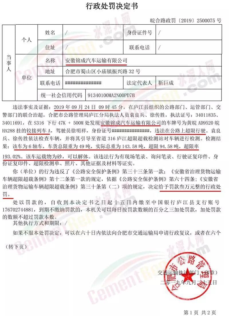 9月26日生效的《關(guān)于對安徽錦成汽車運輸有限公司違法在公路上超限行駛進行處罰的決定》(皖合路政罰〔2019〕2500075號)提到2019年09月24日09時45分,在廬江縣組織的公路部門、運管部門、交警部門的聯(lián)合治超,合肥市公路管理局廬江分局執(zhí)法人員發(fā)現(xiàn)安徽錦成汽車運輸有限公司的車牌號為黃皖AD9520皖HA288掛的鉸接列車A,違法在公路上超限行駛。執(zhí)法人員依法檢查車輛,并將其引導至省道316廬江超限超載檢測站對車輛進行檢測。檢測結(jié)果:該車為6軸車,車貨總限重為49噸,實際總重為143.58噸,超限94.58噸,超限率193.02%。該車運載物為砂,可以解體。上述行為違反了《公路安全保護條例》第三十三條第一款;《安徽省治理貨物運輸車輛超限超載條例》第十二條第一款的規(guī)定,依據(jù)《公路安全保護條例》第六十四條;《安徽省治理貨物運輸車輛超限超載條例》第三十條第(二)項的規(guī)定,決定給予相關(guān)企業(yè)罰款叁萬元整的行政處罰。