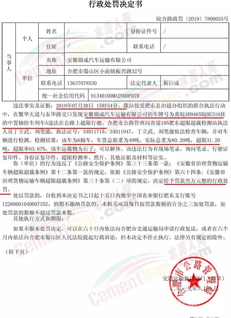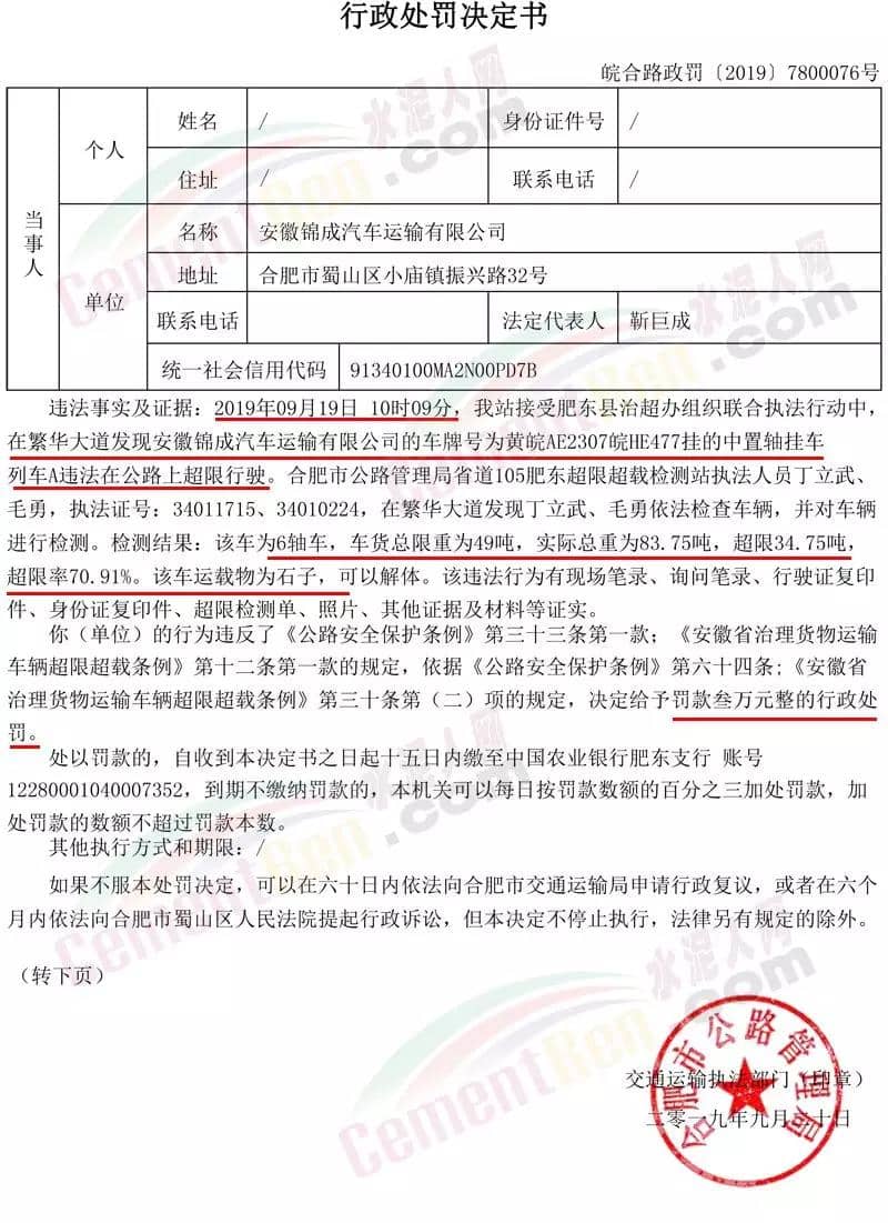 9月24日生效的《關(guān)于對安徽錦成汽車運輸有限公司違法在公路上超限行駛進行處罰的決定》(皖合路政罰〔2019〕7800076號)中違法事實及證據(jù)提到2019年09月19日10時09分,我站接受肥東縣治超辦組織聯(lián)合執(zhí)法行動中,在繁華大道發(fā)現(xiàn)安徽錦成汽車運輸有限公司的車牌號為黃皖AE2307皖HE477掛的中置軸掛車列車A違法在公路上超限行駛。合肥市公路管理局省道105肥東超限超載檢測站執(zhí)法人員依法檢查車輛,并對車輛進行檢測。檢測結(jié)果:該車為6軸車,車貨總限重為49噸,實際總重為83.75噸,超限34.75噸,超限率70.91%。該車運載物為石子,可以解體。上述行為違反了《公路安全保護條例》第三十三條第一款;《安徽省治理貨物運輸車輛超限超載條例》第十二條第一款的規(guī)定,依據(jù)《公路安全保護條例》第六十四條;《安徽省治理貨物運輸車輛超限超載條例》第三十條第(二)項的規(guī)定,決定給予罰款叁萬元整的行政處罰。