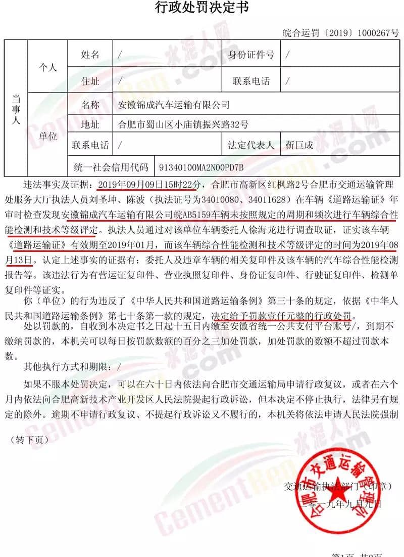 合肥市政府信息公開網(wǎng)9月12日公開信息《安徽錦成汽車運輸有限公司不按規(guī)定維護和檢測運輸車輛的案》提到:2019年09月09日15時22分,合肥市高新區(qū)紅楓路2號合肥市交通運輸管理處服務(wù)大廳執(zhí)法人員劉圣坤、陳波(執(zhí)法證號為34010080、34011628)在車輛《道路運輸證》年審時檢查發(fā)現(xiàn)安徽錦成汽車運輸有限公司皖AB5159車輛未按照規(guī)定的周期和頻次進行車輛綜合性能檢測和技術(shù)等級評定。執(zhí)法人員通過對該單位車輛委托人徐海龍進行調(diào)查取證,證實該車輛《道路運輸證》有效期至2019年01月,而該車輛綜合性能檢測和技術(shù)等級評定的時間為2019年08月13日。因上述單位的行為違反了《中華人民共和國道路運輸條例》第三十條的規(guī)定,依據(jù)《中華人民共和國道路運輸條例》第七十條第一款的規(guī)定,決定給予罰款壹仟元整的行政處罰。