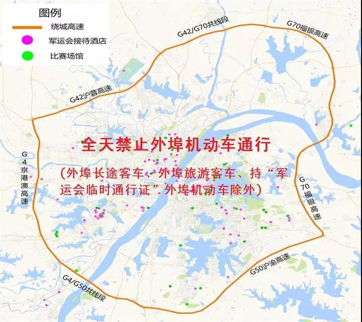 危爆物品運(yùn)輸車限行、禁行關(guān)于外埠機(jī)動(dòng)車,武漢市繞城高速公路以內(nèi)的區(qū)域(不含繞城高速公路)全天禁止外埠機(jī)動(dòng)車通行,外埠長途客車、外埠旅游客車、持“軍運(yùn)會(huì)臨時(shí)通行證”的外埠機(jī)動(dòng)車除外。