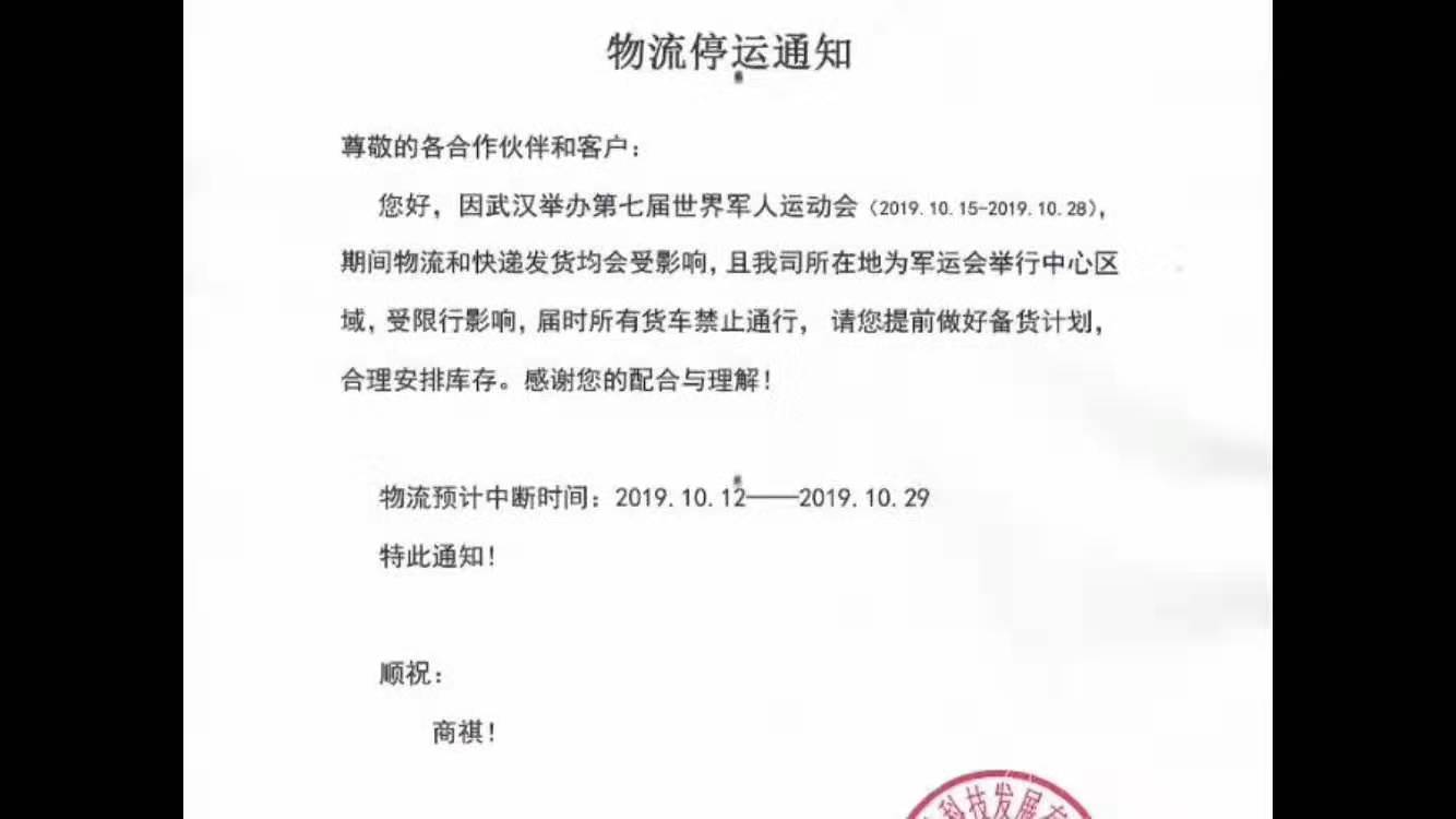 針對(duì)于軍運(yùn)會(huì)的舉行,期間物流和快遞均會(huì)受到影響,屆時(shí)所有貨車禁止通行,請?zhí)崆白龊脗湄浻?jì)劃,合理安排庫存。物流預(yù)計(jì)中斷時(shí)間:2019年10月12日至2019年10月29日。