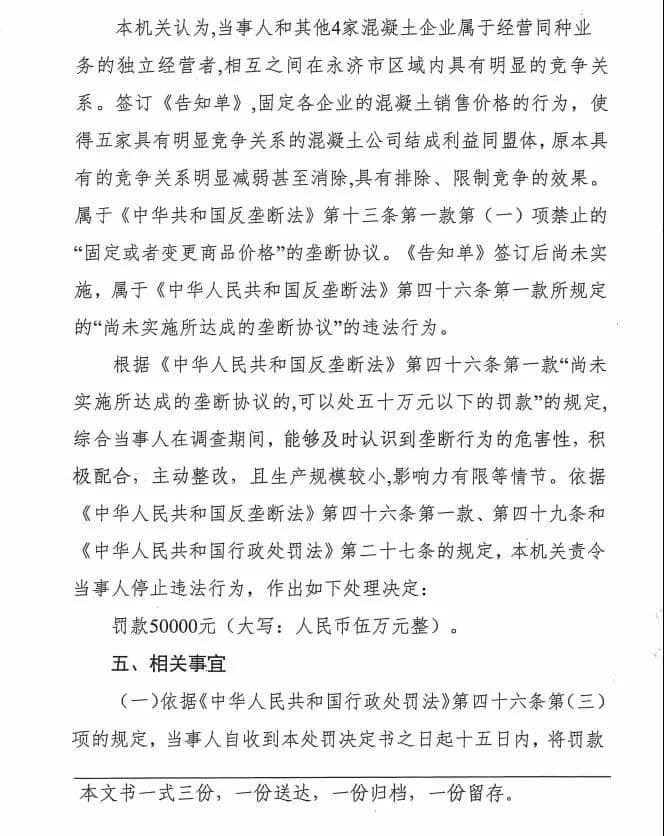 第7號(hào)處罰決定書提到根據(jù)群眾舉報(bào),永濟(jì)市鑫力混凝土有限公司、永濟(jì)市寶寶混凝土有限公司、永濟(jì)市毅達(dá)混凝土有限公司、永濟(jì)市晉鑫混凝土有限、永濟(jì)市三鑫混凝土有限公司等五家企業(yè)于上年10月31日共同簽訂《商品混凝土調(diào)價(jià)告知單》約定于當(dāng)年11月1日起執(zhí)行統(tǒng)一約定的價(jià)格,涉嫌壟斷。