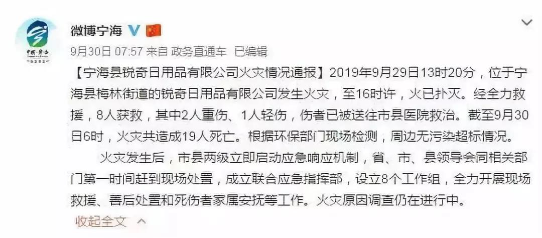 9月30日7時(shí)57分,寧??h委相關(guān)部門(mén)發(fā)布通告,稱(chēng)在此次火災(zāi)中,經(jīng)全力救援,8人獲救,其中2人重傷、1人輕傷,傷者已被送往市縣醫(yī)院救治。截至9月30日6時(shí),火災(zāi)共造成19人死亡。