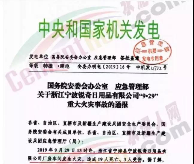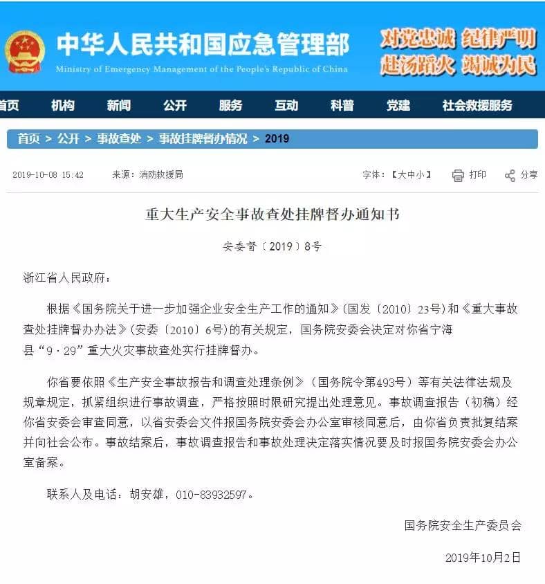 10月8日國(guó)家應(yīng)急管理部官網(wǎng)發(fā)布來(lái)自于消防救援局的《重大生產(chǎn)安全事故查處掛牌督辦通知書(shū)》(安委督﹝2019﹞8號(hào))提到根據(jù)《國(guó)務(wù)院關(guān)于進(jìn)一步加強(qiáng)企業(yè)安全生產(chǎn)工作的通知》(國(guó)發(fā)﹝2010﹞23號(hào))和《重大事故查處掛牌督辦辦法》(安委﹝2010﹞6號(hào))的有關(guān)規(guī)定,國(guó)務(wù)院安委會(huì)決定對(duì)浙江省寧波市寧??h“9·29”重大火災(zāi)事故查處實(shí)行掛牌督辦。通知要求浙江省依照《生產(chǎn)安全事故報(bào)告和調(diào)查處理?xiàng)l例》(國(guó)務(wù)院令第493號(hào))等有關(guān)法律法規(guī)及規(guī)章規(guī)定,抓緊組織進(jìn)行事故調(diào)查,嚴(yán)格按照時(shí)限研究提出處理意見(jiàn)。