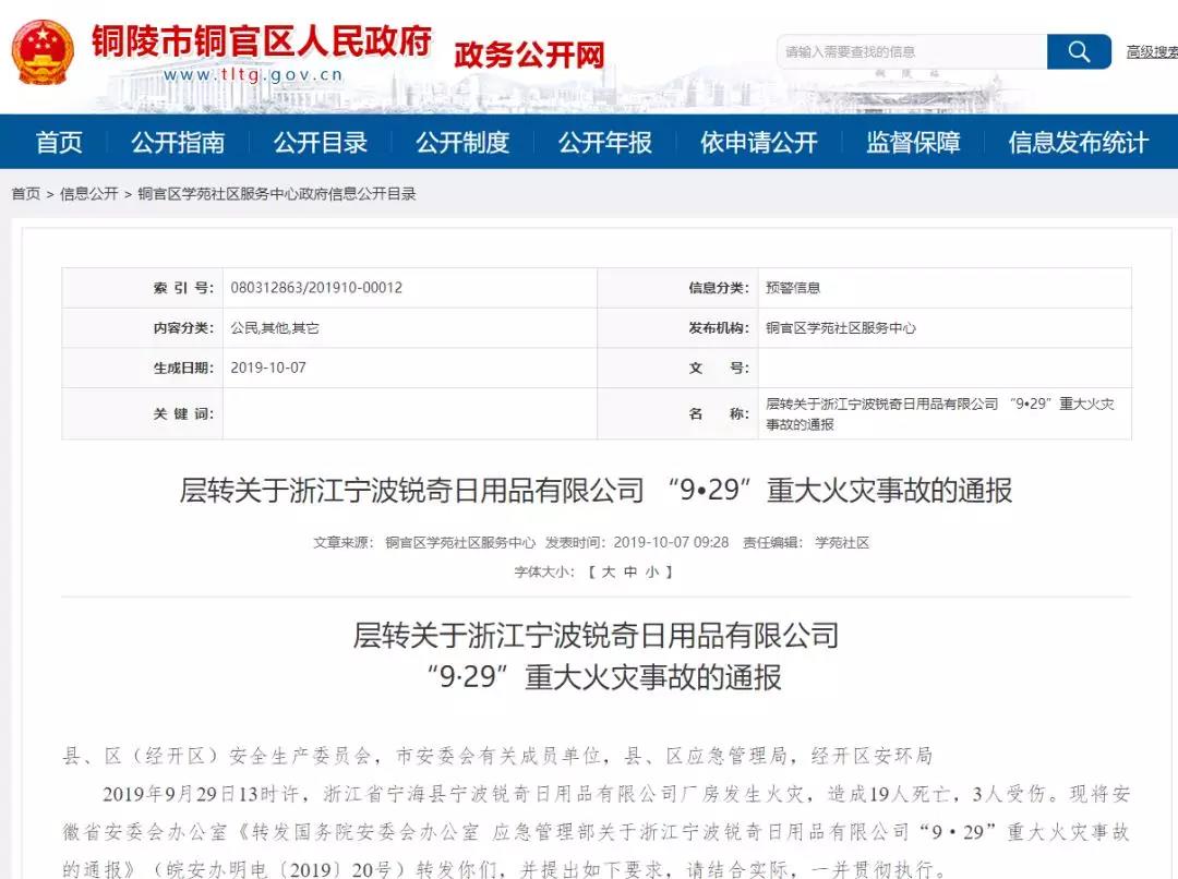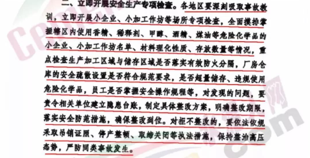 事故發(fā)生后,各級(jí)機(jī)關(guān)非常重視。10月3日,國(guó)務(wù)院安委會(huì)辦公室、應(yīng)急管理部下發(fā)了《關(guān)于浙江寧波銳奇日用品有限公司“9•29”重大火災(zāi)事故的通報(bào)》的特提文件。文件指出,初步調(diào)查表明,火災(zāi)系車(chē)間工作人員在一層香水灌裝區(qū)域生產(chǎn)過(guò)程中操作不當(dāng)引發(fā)塑料制品、包裝紙以及三甘酯、異構(gòu)十二烷、香精等原料燃燒。并要求各地立即開(kāi)展小企業(yè)、小加工作坊等場(chǎng)所安全生產(chǎn)專(zhuān)項(xiàng)檢查。