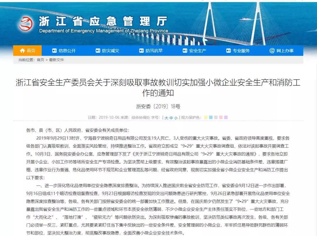 10月6日,浙江省應(yīng)急管理廳發(fā)布了《浙江省安全生產(chǎn)委員會(huì)關(guān)于深刻吸取事故教訓(xùn)切實(shí)加強(qiáng)小微企業(yè)安全生產(chǎn)和消防工作的通知》,稱(chēng)省政府立即成立了“9•29”重大火災(zāi)事故調(diào)查組,對(duì)該起事故開(kāi)展調(diào)查工作,并要求各級(jí)各部門(mén)認(rèn)真吸取教訓(xùn),全面落實(shí)風(fēng)險(xiǎn)管控,持續(xù)推進(jìn)整治工作。