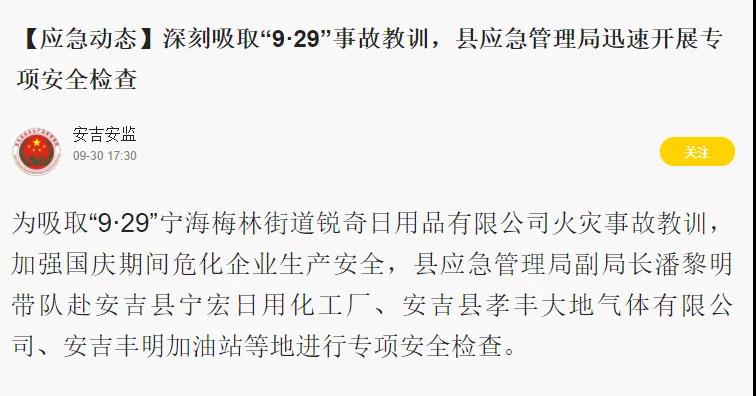 事故發(fā)生后,浙江省湖州市安吉縣應(yīng)急管理局深刻吸取“9.29”事故教訓(xùn),迅速開(kāi)展了專(zhuān)項(xiàng)安全檢查。由縣應(yīng)急管理局副局長(zhǎng)親自帶隊(duì)趕區(qū)域內(nèi)相關(guān)企業(yè)進(jìn)行專(zhuān)項(xiàng)安全檢查。