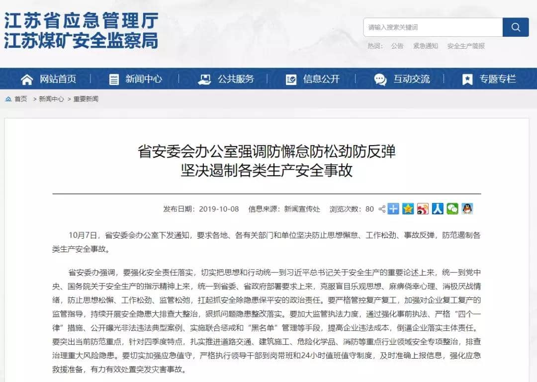 10月7日10月7日,江蘇省安委會(huì)辦公室下發(fā)通知,要求各地、各有關(guān)部門(mén)和單位堅(jiān)決防止思想懈怠、工作松勁、事故反彈,防范遏制各類(lèi)生產(chǎn)安全事故。