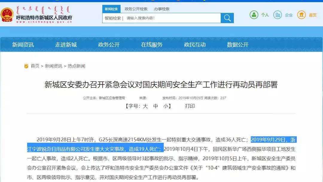 10月5日內(nèi)蒙古呼和浩特市新城區(qū)人民政府轉(zhuǎn)發(fā)新城區(qū)應(yīng)急管理部消息稱(chēng),2019年9月28日上午7時(shí)許,G25長(zhǎng)深高速2154KM處發(fā)生一起特別重大交通事故,造成36人死亡;2019年9月29日,浙江寧波銳奇日用品有限公司發(fā)生重大火災(zāi)事故,造成19人死亡;2019年10月4日下午,回民區(qū)新華廣場(chǎng)西側(cè)振華項(xiàng)目工地發(fā)生一起亡人事故,造成2人死亡。根據(jù)市、區(qū)兩級(jí)領(lǐng)導(dǎo)對(duì)3起事故的批示、指示精神,2019年10月5日上午,新城區(qū)安全生產(chǎn)委員會(huì)辦公室召開(kāi)緊急會(huì)議,會(huì)上傳達(dá)了呼和浩特市安全生產(chǎn)委員會(huì)辦公室文件《關(guān)于“10·4”建筑領(lǐng)域生產(chǎn)安全事故的通報(bào)》和市、區(qū)兩級(jí)領(lǐng)導(dǎo)批示、指示意見(jiàn),并對(duì)十一期間安全生產(chǎn)工作進(jìn)行再動(dòng)員再部署。