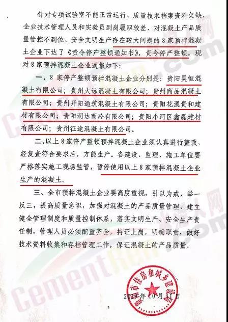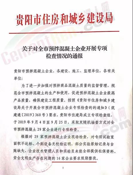 貴陽市預拌混凝土企業(yè),各建設、施工、監(jiān)理單位,各有關單位: 為了進一步加強對預拌商品混凝土質量的監(jiān)督管理,規(guī)范全市預拌混凝土的生產和使用,促進預拌混凝土企業(yè)提高產品質量,確保建設工程質量。按照《貴陽市住房和城鄉(xiāng)建設局關于開展全市預拌混凝土企業(yè)專項檢查的通知》(筑建通〔2019〕360號)要求,貴陽市住建局成立專項檢查組,于2019年9月4曰至9月25曰,采取雙隨機抽査方式對全市預拌混凝土29家企業(yè)進行專項檢査?! 「鶕?9家預拌混凝土企業(yè)現場檢査,對專項試驗室 面積不達標,個別設備無校檢證明,部分實驗原始記錄與合賬缺失,企業(yè)技術管理人員和實驗資未能全部提供社保資料, 安全文明生產存在問題的16家企業(yè)要求限期整改?! ♂槍m椩囼炇也荒苷_\行、質量技術檔案資料欠缺、 企業(yè)技術管理人員和實驗員到崗履職較差、對混凝土產品質量管控不到位、安全文明生產存在較大問題的8家預拌混凝 土企業(yè)下達了《責令伴產整頓通知書》,責令停產整頓?,F對8家預拌混凝土企業(yè)通報如下: 一、8家停產整頓預拌混凝土企業(yè)分別是:貴陽昊恒混凝土有限公司;貴州大遠混凝土有限公司;貴州商品混凝土有限公司;貴州開陽通筑混凝土有限公司;貴陽花溪貴和建材有限公司;貴陽潤達商砼有限公司;貴陽小河區(qū)鑫磊建材有限公司;貴州征途混凝土有限公司。 二、以上8家停產整頓預拌混凝土企業(yè)須認真進行整改, 經復査符合要求后,方能生產。各建設、監(jiān)理,施工單位要嚴格落實施工現場監(jiān)管,暫停使用以上8家預拌混凝土企業(yè)生產的混凝土?! ∪?、全市預拌混凝土企業(yè)要高度重視,引以為戒,舉一 反三,提高質量意識,加強對混凝土的產品質量管理,建立健全管理制度和質量控制體系,落實文明生產、安全生產責 任制,管理人員必須配置齊全,持證上崗,明確職責,做好技術資料收集和存檔管理工作,保證混凝土的產品質量。