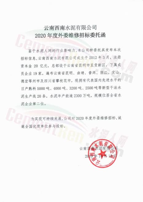 云南西南水泥2010年外委維修招標(biāo)公告全文如下: