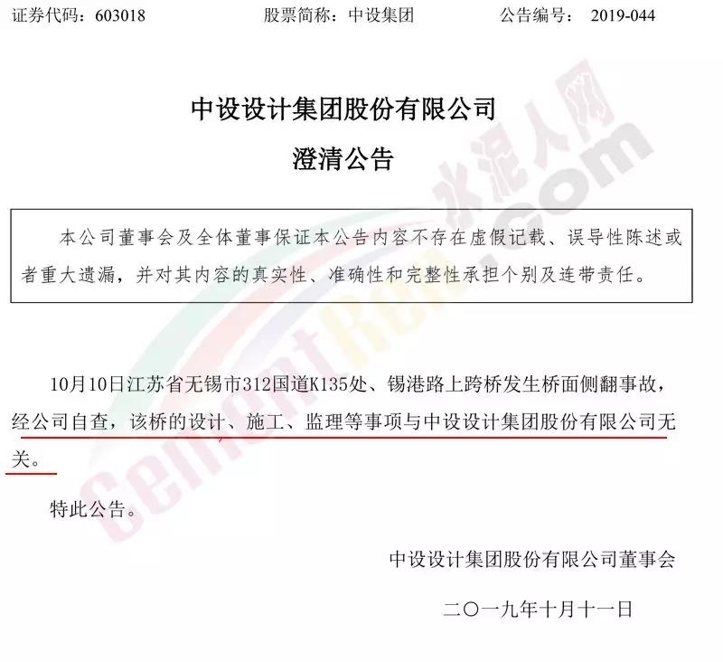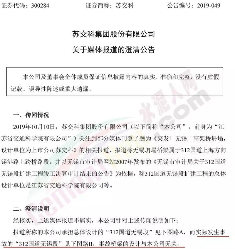 10月11日早間,該公司發(fā)公告稱,報(bào)道不屬實(shí),公司承擔(dān)總體設(shè)計(jì)的“312國道無錫段”并非事故路段,事故橋梁的設(shè)計(jì)與公司無關(guān)。
